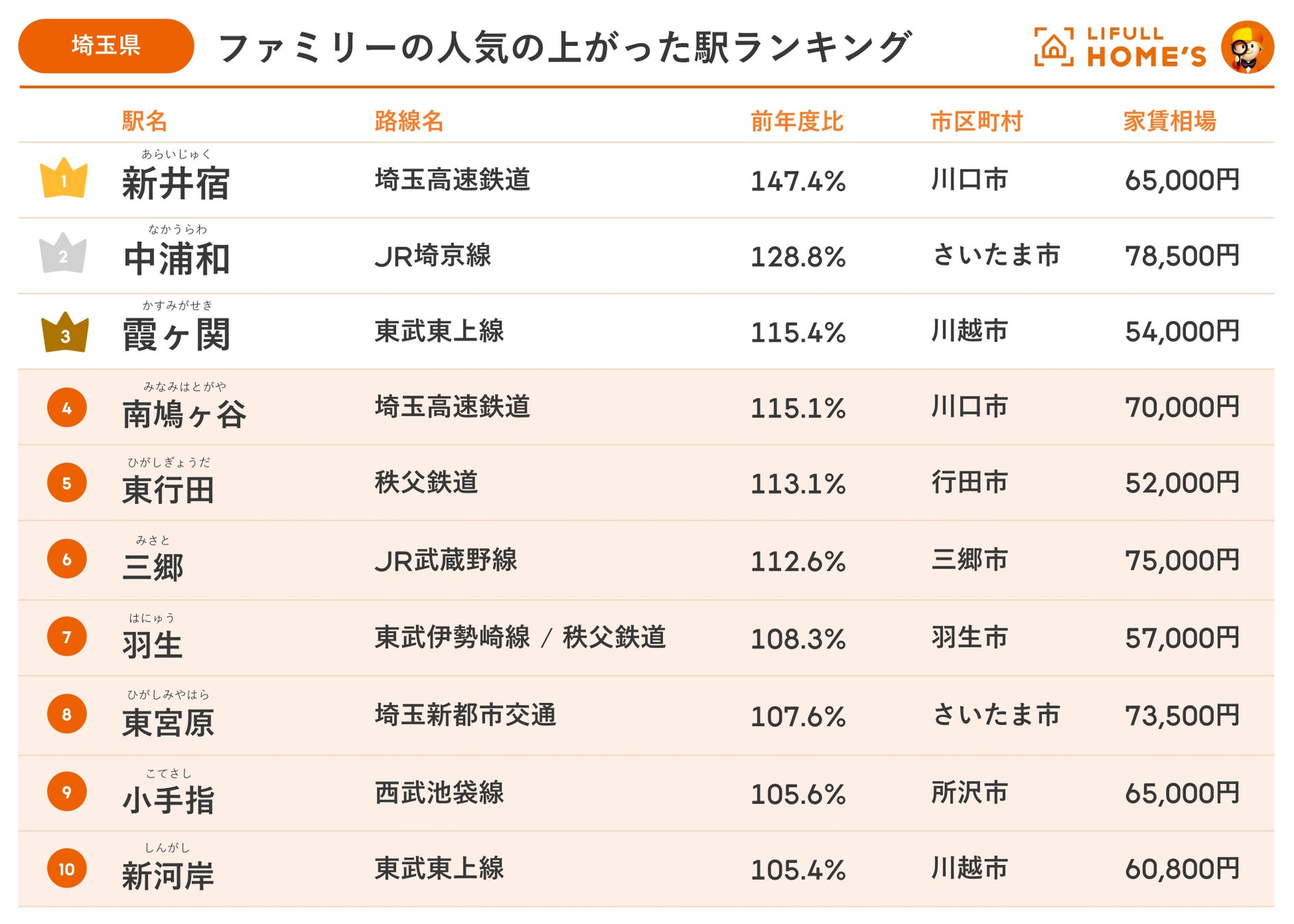 ほかに、大宮付近では2位「中浦和」や8位「東宮原」がランクイン。交通利便性を確保しながらも、比較的家賃の抑えられる駅の人気が高まっているようです。また、9位「小手指」は西武池袋線の始発駅なので、池袋勤務の方にとっては嬉しい駅です。