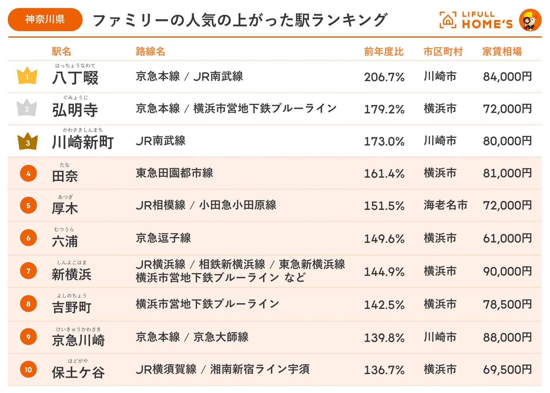 1位は京急本線とJR南武線が交差する「八丁畷」となりました。前年度比は206.7%と、神奈川県で唯一の200%超えです。駅周辺は住宅街が広がり、北側には川崎警察署もあるため治安が比較的良い駅です。繫華街の川崎エリアに徒歩で行くことも可能なので、閑静な住宅街で暮らしながら、交通利便性・生活利便性のどちらも享受できるため、ファミリー層に人気の駅です。また、八丁畷の隣駅である3位「川崎新町」、9位「京急川崎」もランクインしています。