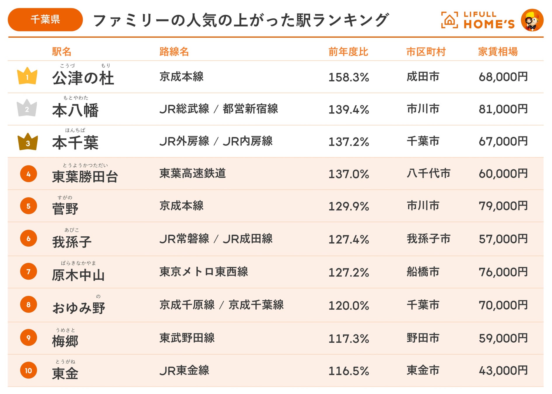 ほかには、3位「本千葉」、8位「おゆみ野」といった、京成千葉にアクセスしやすい駅がランクインしています。