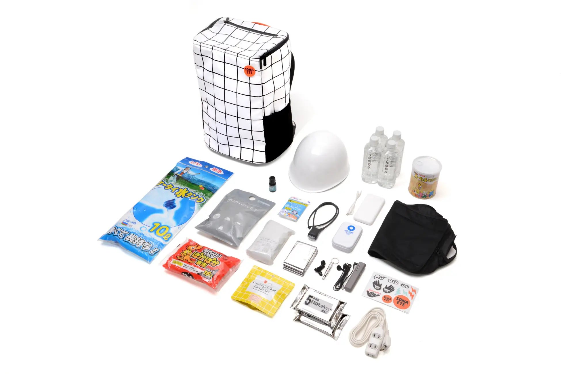 セット内容:ヘルメット、LEDネックライト、FMポケットラジオ、アルミ防寒シート、レインポンチョ、簡易トイレセット、ホイッスル、簡易手当キット、ペーパー歯みがき(5包)、ウェットティッシュ(2個)、延長コード、ハッカ油、モバイルバッテリー、カイロ(10枚)、給水タンク、SONAETEステッカー、リュック用メッシュポーチ、イザメシ 7年保存水 500ml(4本)、ギンビス×イザメシ 厚焼きたべっ子どうぶつ、SONAETEオリジナルお菓子セット