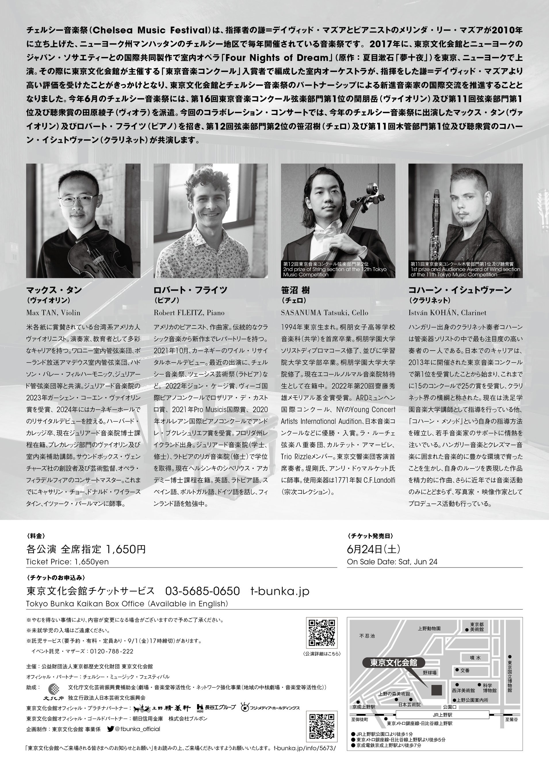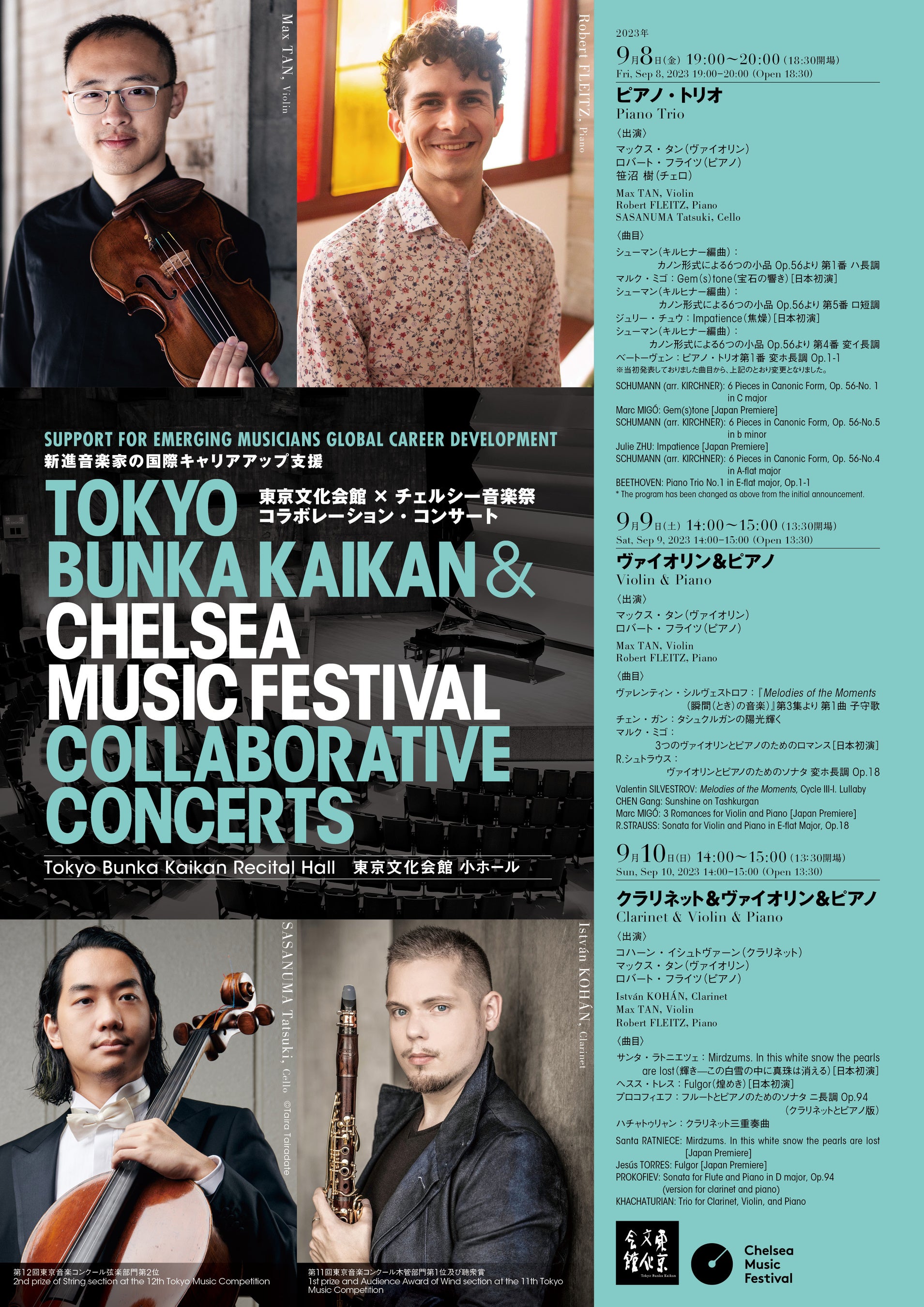 今年6月のチェルシー音楽祭には、東京音楽コンクール入賞者の関朋岳(ヴァイオリン)と田原綾子(ヴィオラ)を派遣。今回のコラボレーション・コンサートでは、チェルシー音楽祭に出演したマックス・タン(ヴァイオリン)及びロバート・フライツ(ピアノ)を招き、東京音楽コンクール入賞者の笹沼樹(チェロ)及びコハーン・イシュトヴァーン(クラリネット)が共演します。