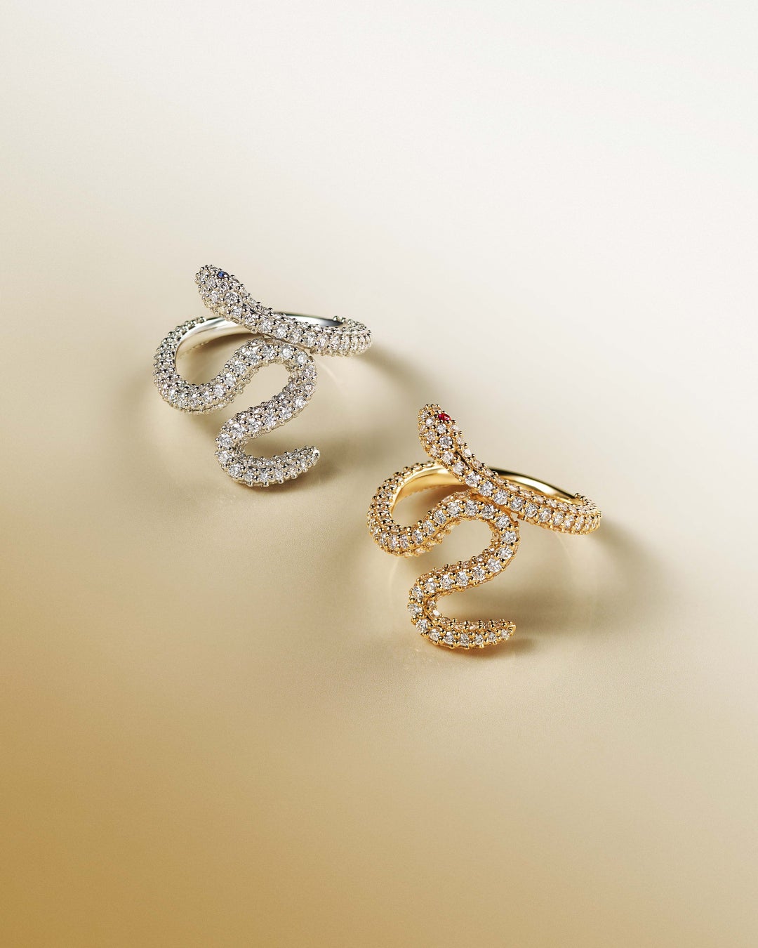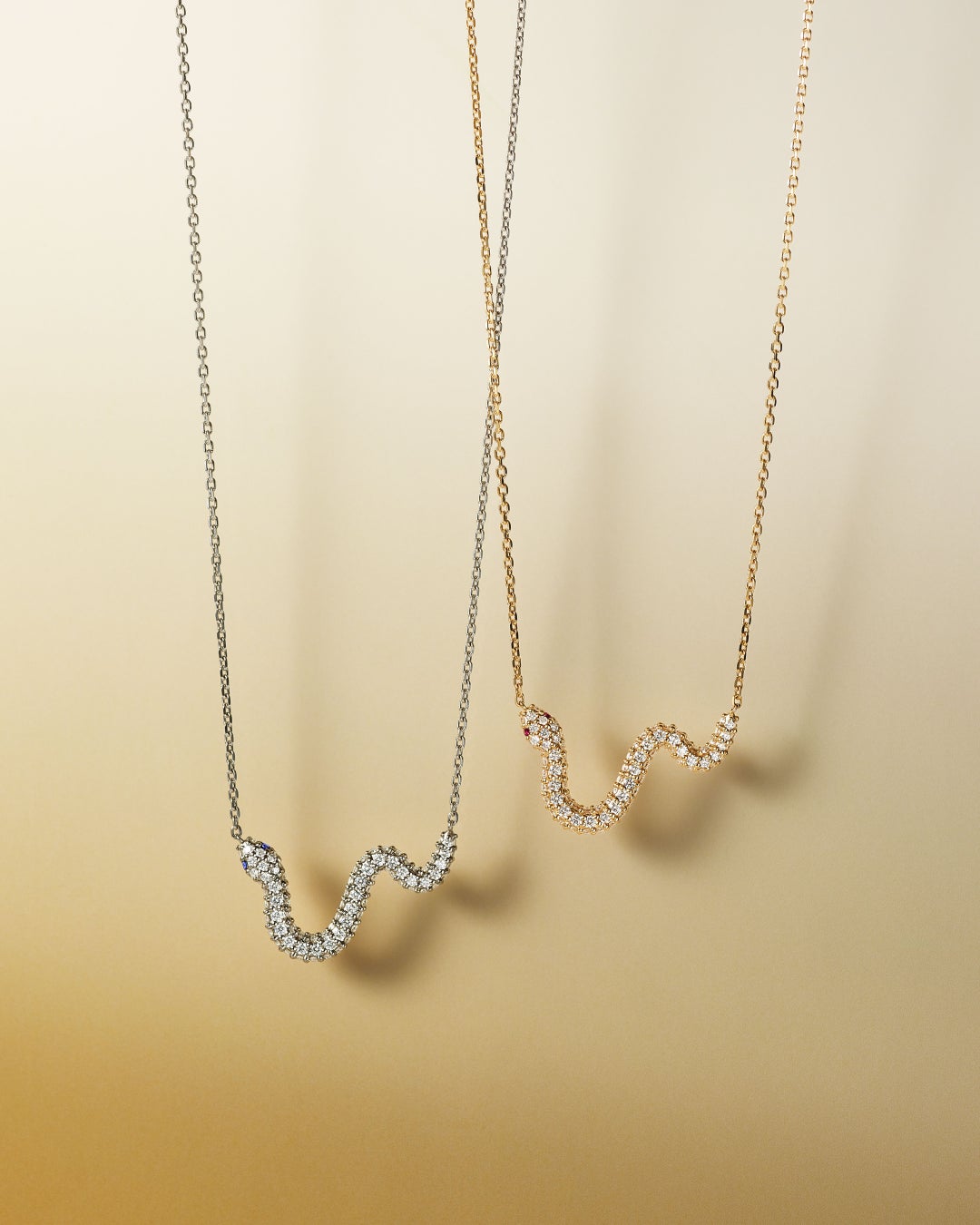 ネックレスは、アオダイショウのしなやかなフォルムを繊細に表現。リングは、さり気ない細身のフォルムでシンプルな中にも華やかさがあり、柔らかな曲線が指元を美しく魅力的にみせてくれます。目にはルビーやサファイアをセッティング。アオダイショウの神秘的な美しさが際立ちます。