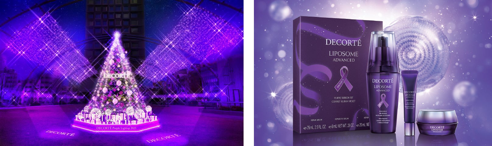 啓発活動においては、昨年に続き、パープル・ライトアップ「DECORTÉ Purple Lightup 2023」を開催。「MIYASHITA CHRISTMAS PARK 2023」と連動し、テーマ「LOVE PURPLE(※2)」に合わせ、同運動のシンボルである「パープルリボン」と、ブランドを代表する“リポソーム美容液”を象徴するパープルのカラーで宮下公園を彩ります。今年はエリアを拡大し、新たなデザインのクリスマスツリーや、巨大なリポソームのフォトスポットなども登場します。また、商業施設「RAYARD MIYASHITA PARK」のNorth 2階・3階でもパープルカラーをテーマにしたイルミネーションが実施される他、ホテル「sequence MIYASHITA PARK」でも、エントランス照明や館内のクリスマス装飾をパープルに統一し、MIYASHITA PARK全体がパープルにライトアップされている様子をお楽しみいただけます。