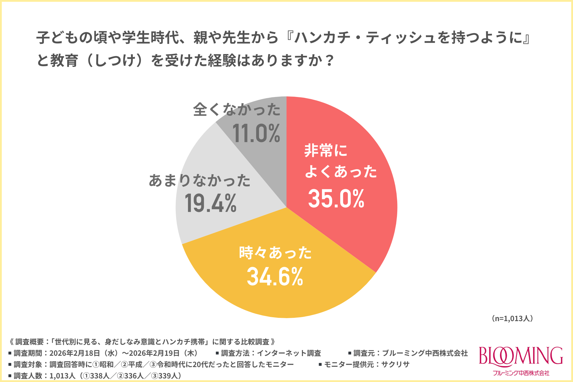 「子どもの頃や学生時代、親や先生から『ハンカチ・ティッシュを持つように』と教育(しつけ)を受けた経験はあるか」と尋ねたところ、約7割が『非常によくあった(35.0%)』『時々あった(34.6%)』と回答しました。