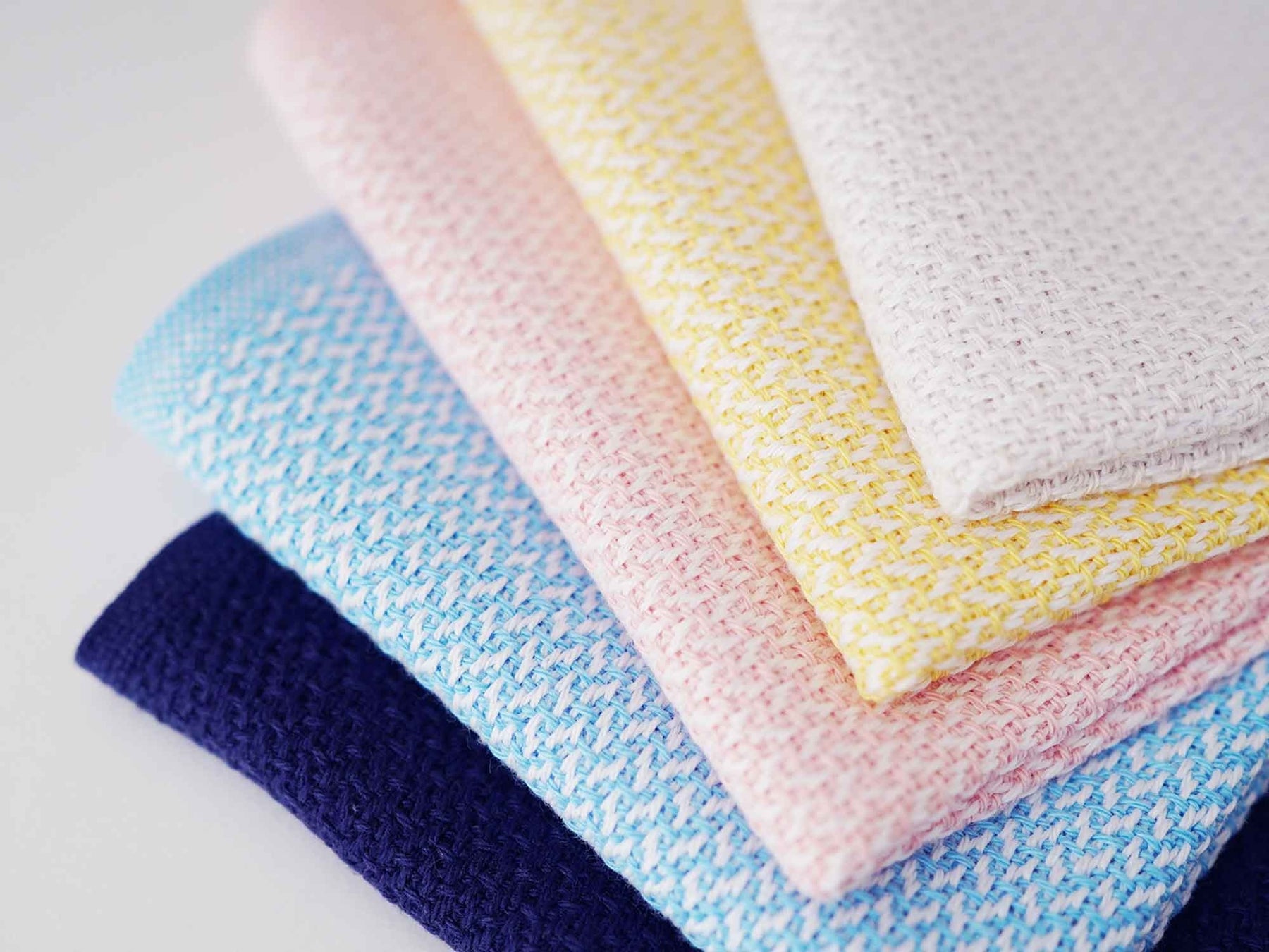 西インド諸島産海島綿のDNAを100%継承した、超長綿の中でもトップクラスの品質を持つ「アメリカンシーアイランドコットン」を使用し、18番手という太めな糸を3本撚り合わせた糸で織り上げ、程よい厚みでハンカチーフとタオルの中間のようなふかふかとした触り心地が特徴です。