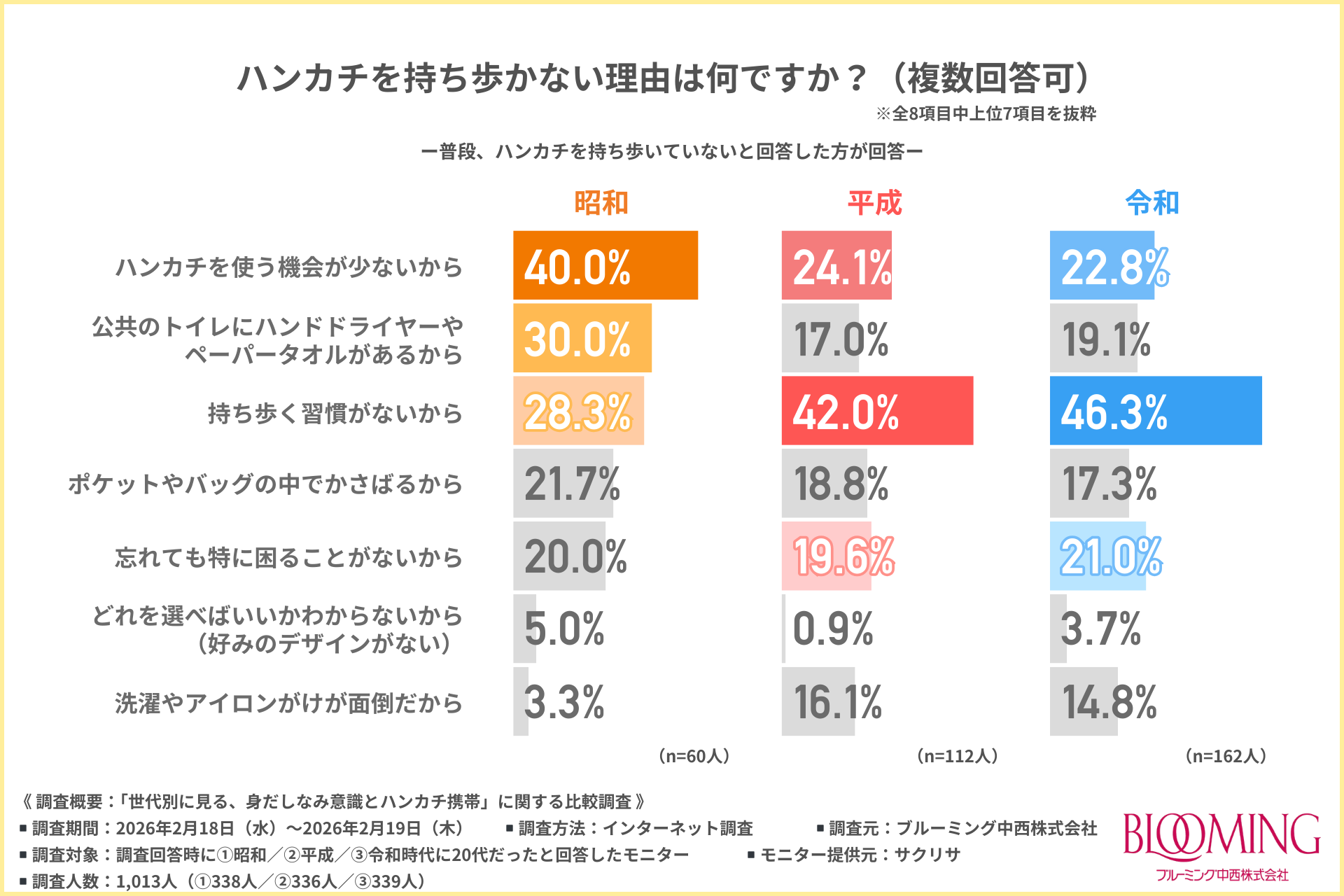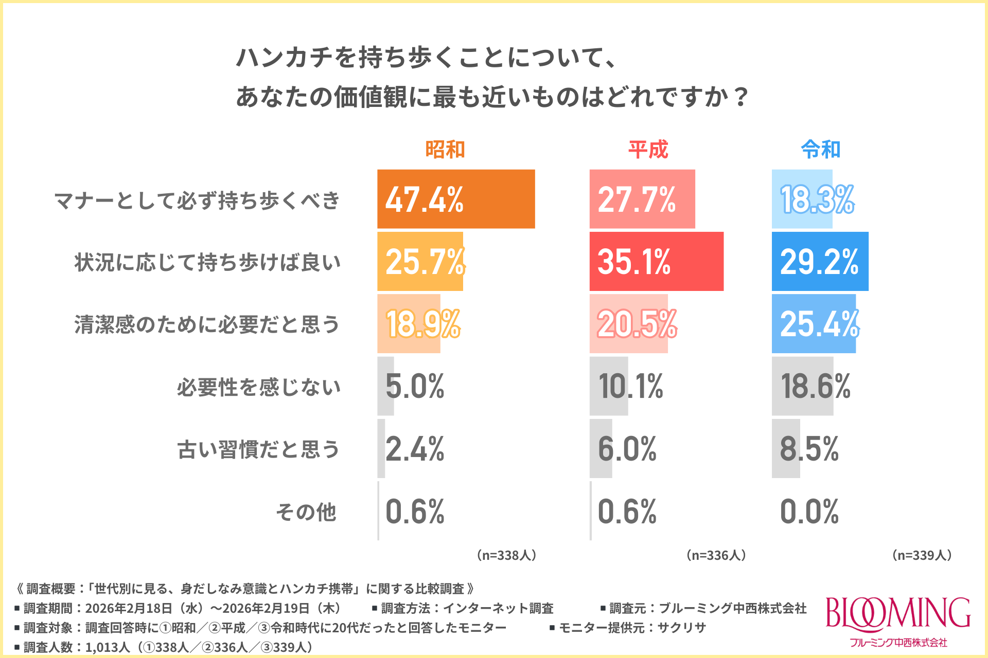 ブルーミング中西株式会社(所在地:東京都中央区、取締役社長:中西 一)は、①昭和/②平成/③令和時代に20代だった方を対象に、「世代別に見る、身だしなみ意識とハンカチ携帯」に関する比較調査を行いました。