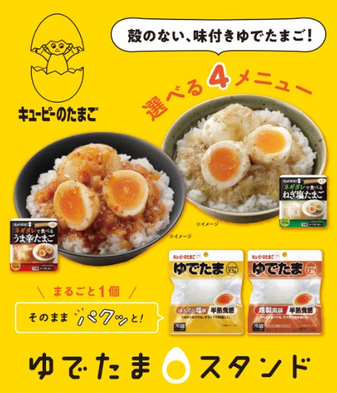 キッチンカー「ゆでたまスタンド」では、今春の新商品「ネギダレで食べる うま辛たまご」「ネギダレで食べる ねぎ塩たまご」(商品を使ったミニ丼)と、殻をむかずに食べられる「ゆでたま ほんのり塩味」と「ゆでたま 燻製風味」を提供します※2。各会場では、オリジナルグッズの配布(先着50名、条件あり)やキユーピーが登場するイベントを行います※3。