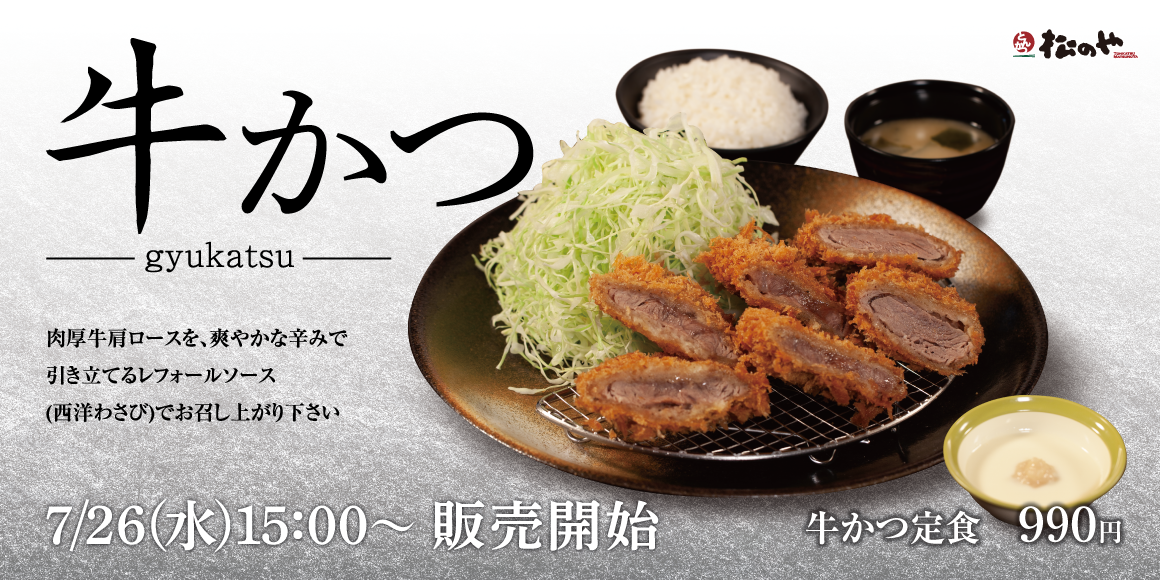 株式会社松屋フーズ(本社:東京都武蔵野市、代表取締役社長:瓦葺 一利)では、とんかつ専門店の「松のや」におきまして、2023年7月26日(水)午後3時より、「牛かつ」を発売いたします。