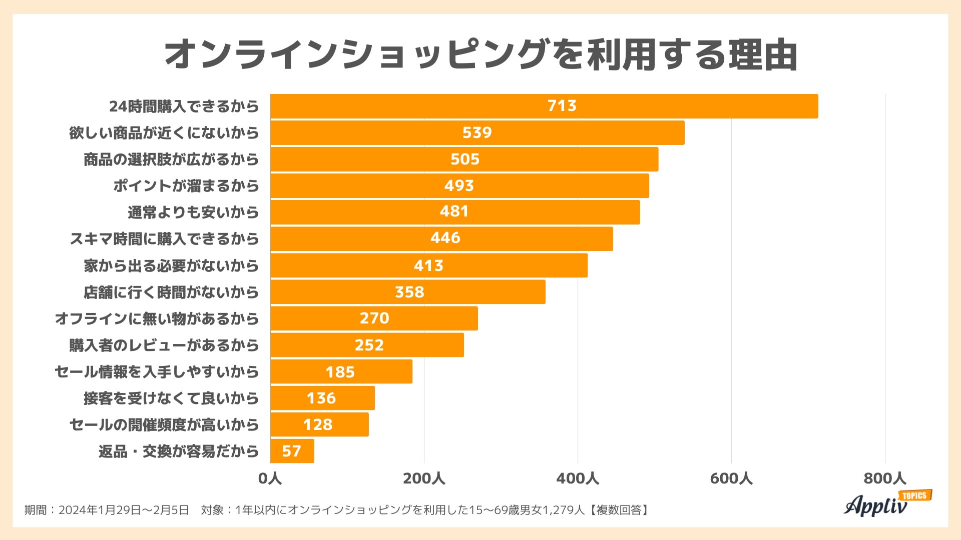 オンラインショッピングを利用する理由について聞いてみると、最も回答が多かったのは「24時間購入できるから(713人)」で、2位「欲しい商品が近くにないから(539人)」、3位「商品の選択肢が広がるから(505人)」でした。