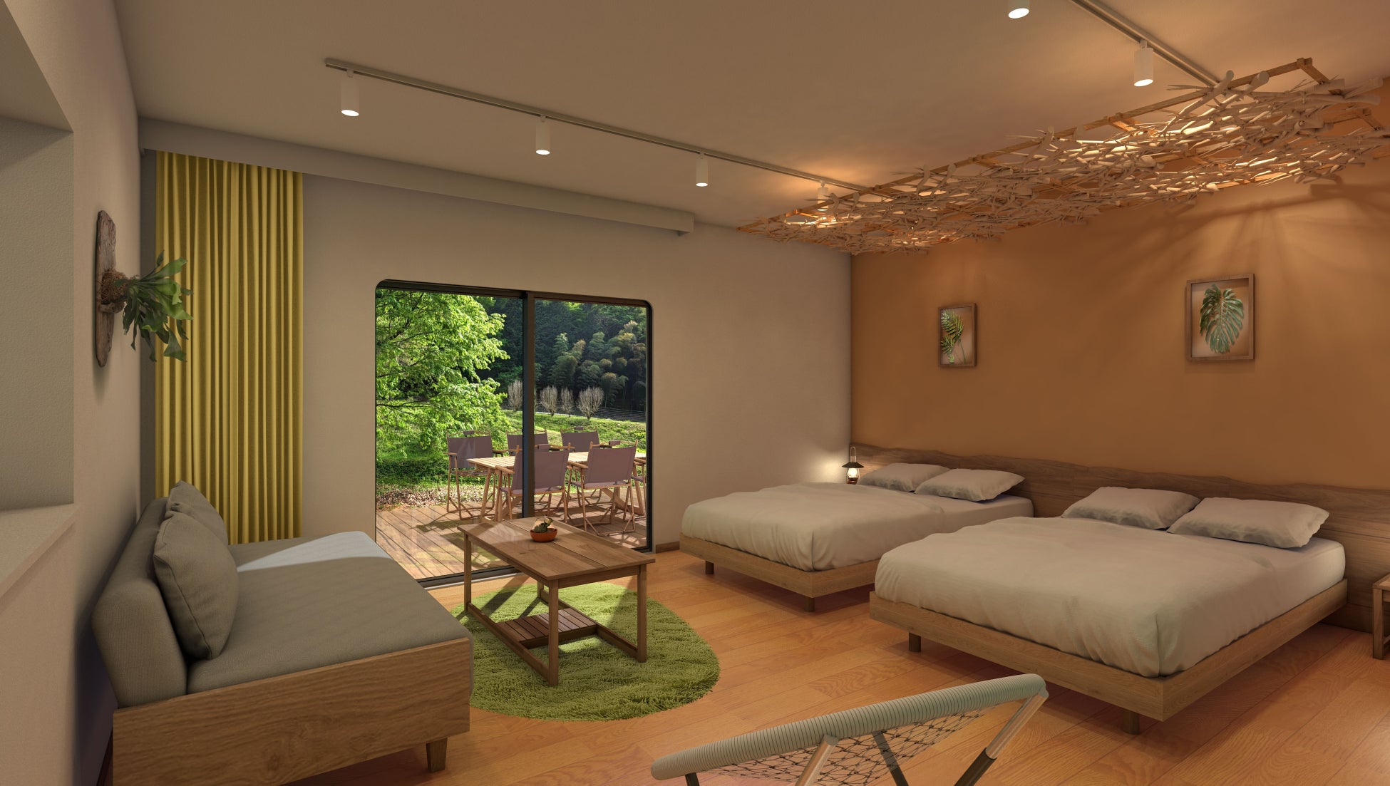 気軽に泊まれるカップルやご友人との滞在にぴったりなお部屋。広々としたデッキでゆったりお過ごしいただけます。廊下から部屋の段差がなく車椅子の方も安心してご利用いただけます。