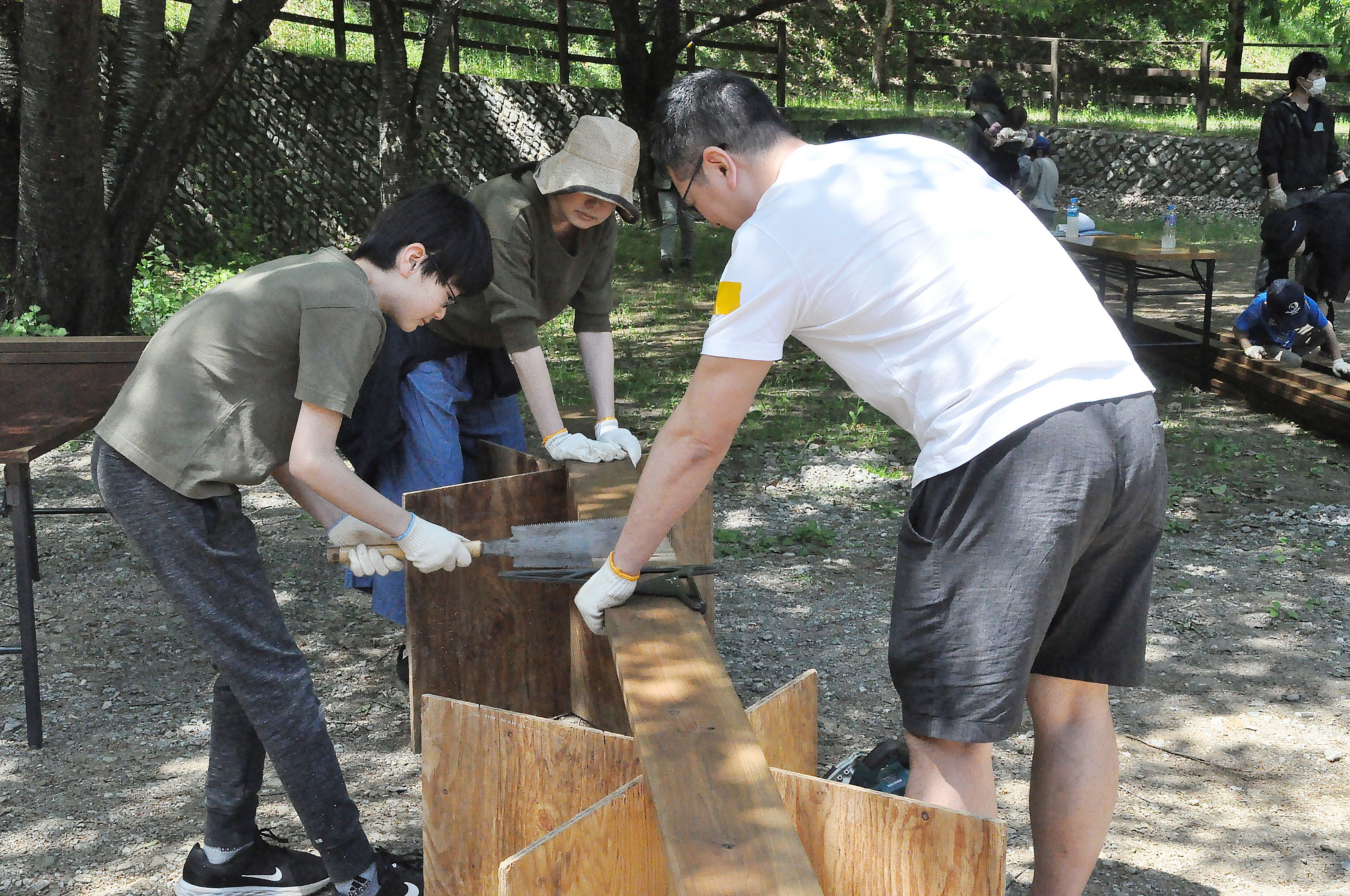 ‘‘自然との共生”をコンセプトに、道を整備し、小屋づくり、家具づくり、遊具づくり、を体験。