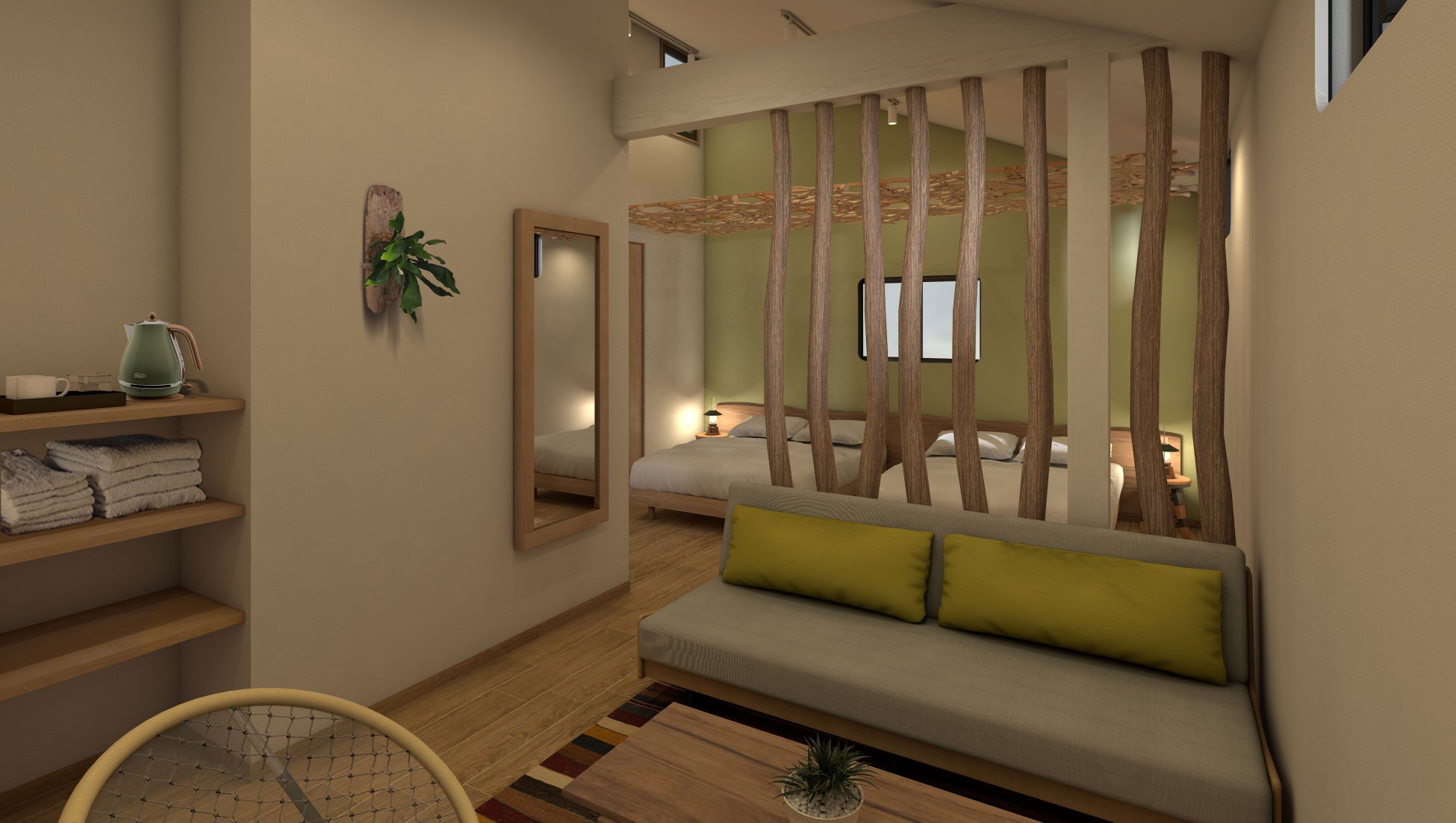 定員:大人2名 最大5名(ダブルベッド2+ソファベッド1)