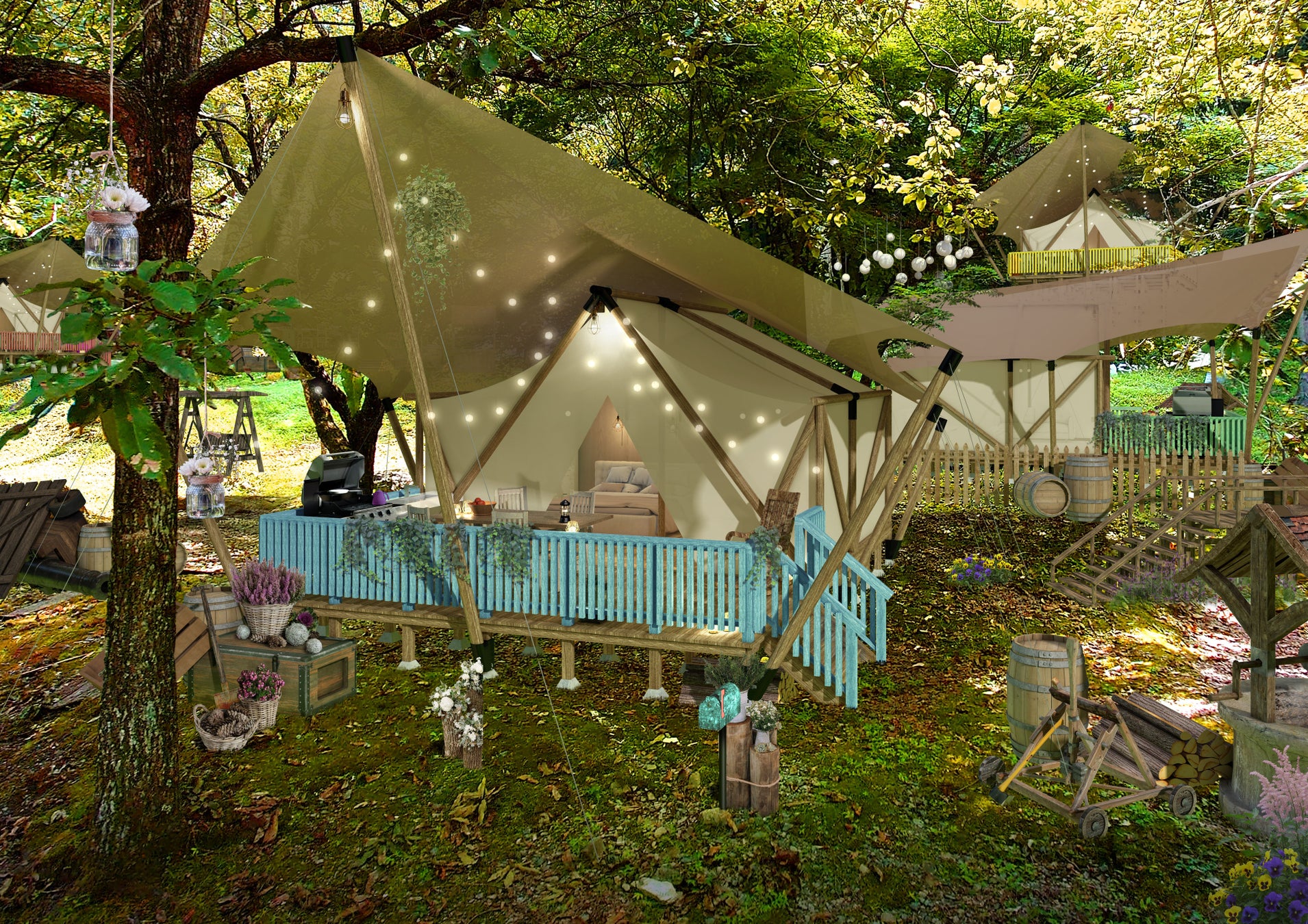 森に囲まれたグランピングエリアにある特別なテント。