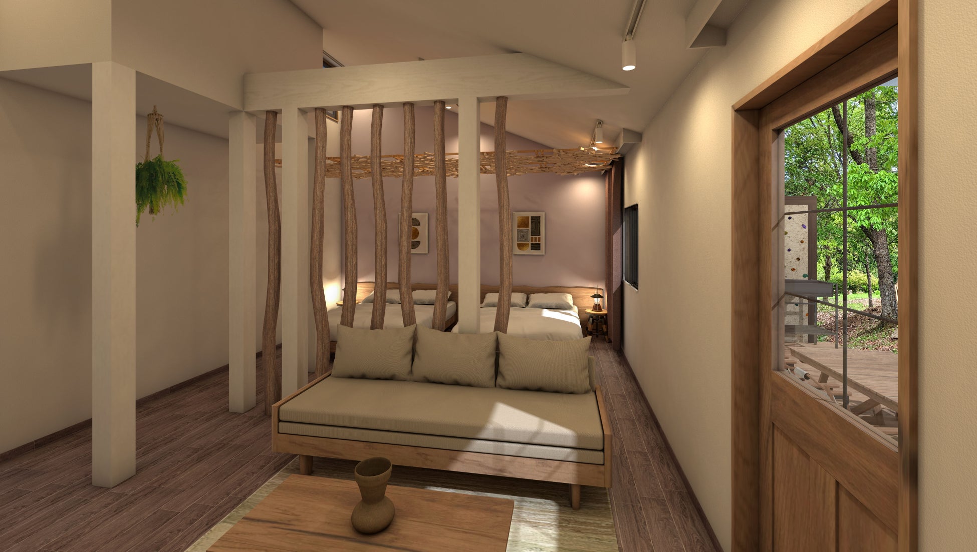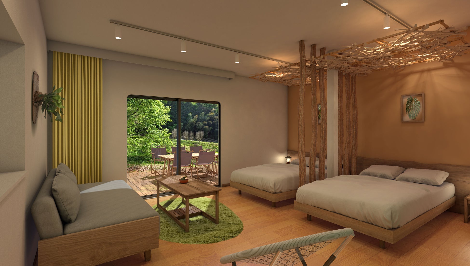「ミューの森」の民が暮らした家をイメージしたオリジナルデザインです。広々リビングルームにダイニングテーブルも設置。6名さままでのグループでのお泊まりに最適です。冷暖房完備で快適にお過ごしいただけます。