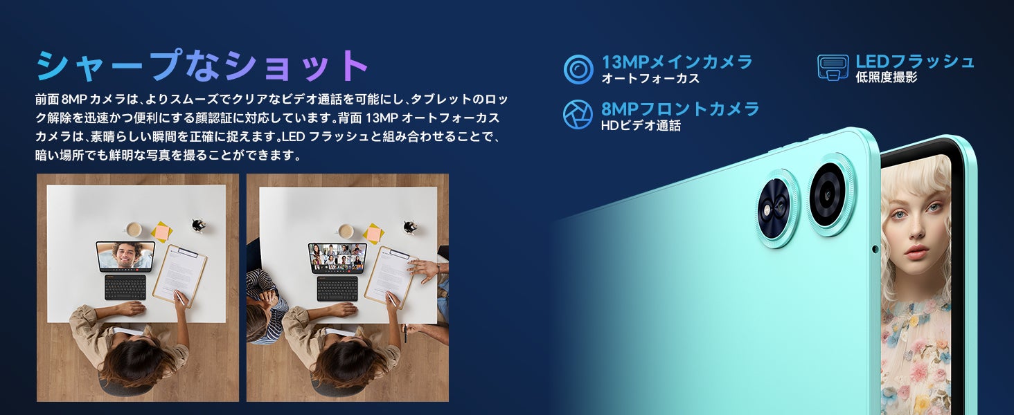 前面8MPカメラは、よりスムーズでクリアなビデオ通話を可能にし、タブレットのロック解除を迅速かつ便利にする顔認証に対応しています。背面の13MPオートフォーカスカメラは、美しい瞬間を正確に捉えます。LEDフラッシュと組み合わせることで、暗い場所でも鮮明な写真を撮ることができます。