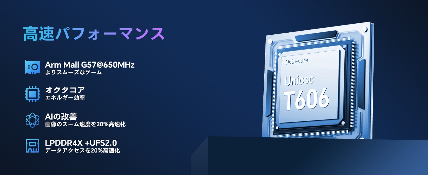 Unisoc T606オクタコアプロセッサを搭載したOdea A12は、1.6GHzの2つの高性能A75コアと6つのエネルギー効率に優れたA55コアを備えています。この強力なセットアップにより、仕事でもエンターテインメントでも最高のパフォーマンスを発揮し、シームレスでエネルギー効率の高いタブレット体験を提供します。