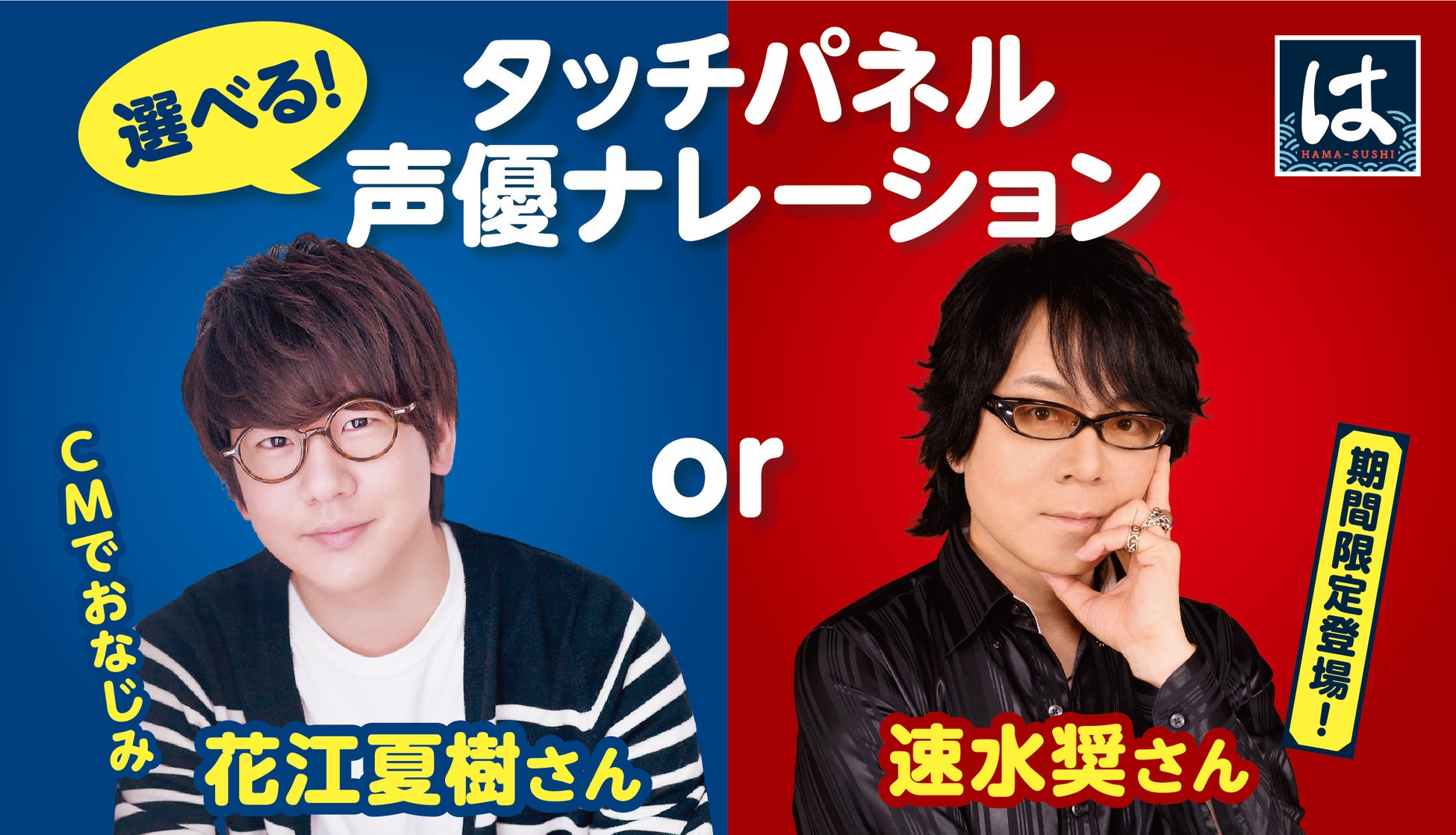 【はま寿司】「選べる!タッチパネル声優ナレーション!」を導入!第1弾は花江夏樹(はなえなつき)さんとあわせて速水奨(はやみしょう)さんが選択可能に!