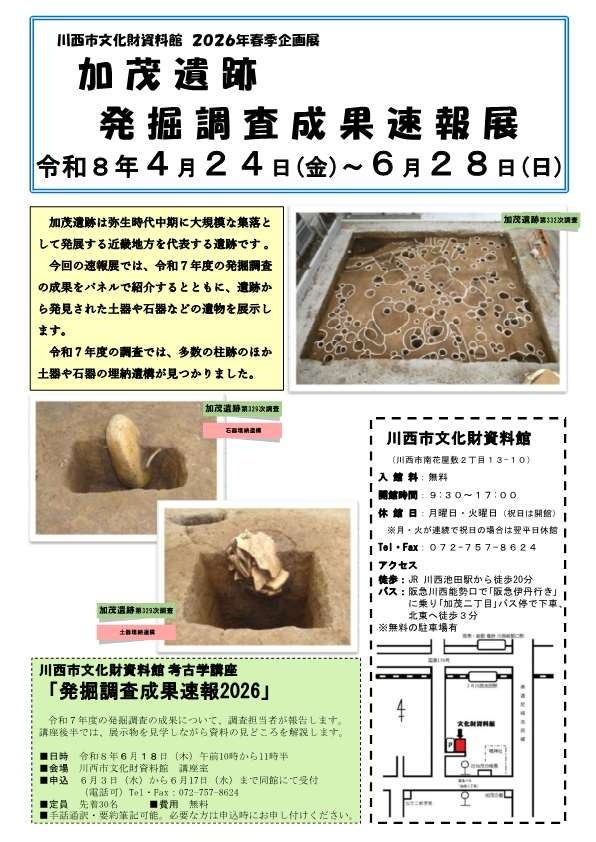 6月18日(木)には、考古学講座「発掘調査成果速報2026」(主催:川西市)を開催します。令和7年度の発掘調査で発見された多数の壺や甕(かめ)、高坏(たかつき)などの遺物と共に、加茂遺跡の特徴や魅力について調査担当者が、講座と展示物を見学しながら解説します。