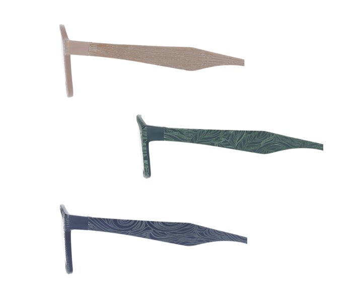 頭部を優しく包み込むように設計された3Dフィットテンプルで、快適なかけ心地を実現しました。また、テンプル(つる)部分に木目や水紋、リーフ柄といった自然のモチーフを取り入れたモデルも登場いたします。(★の品番のみ)