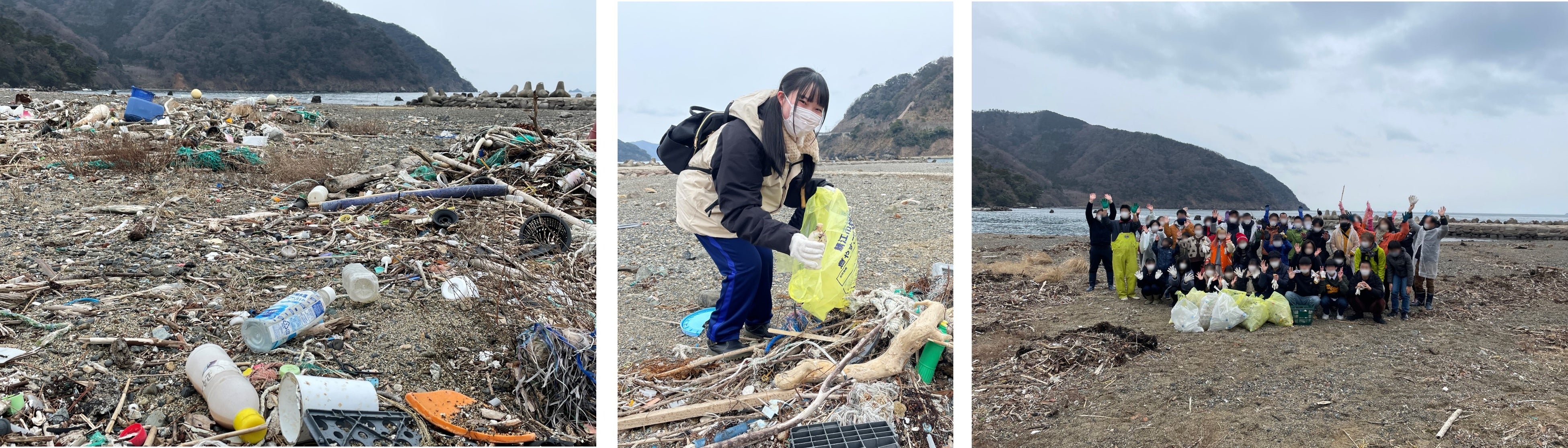 2022年2月13日(日)に環境団体や地元の学生・有志の方など約50名が海岸の清掃活動を実施し、約800本のペットボトルごみを回収しました。回収されたペットボトルは1点1点手作業で洗浄され、市中からの再生ペットボトルで生成された再生プラスチック材と共に加工。メガネフレームや店頭什器の一部材料として使用されました。