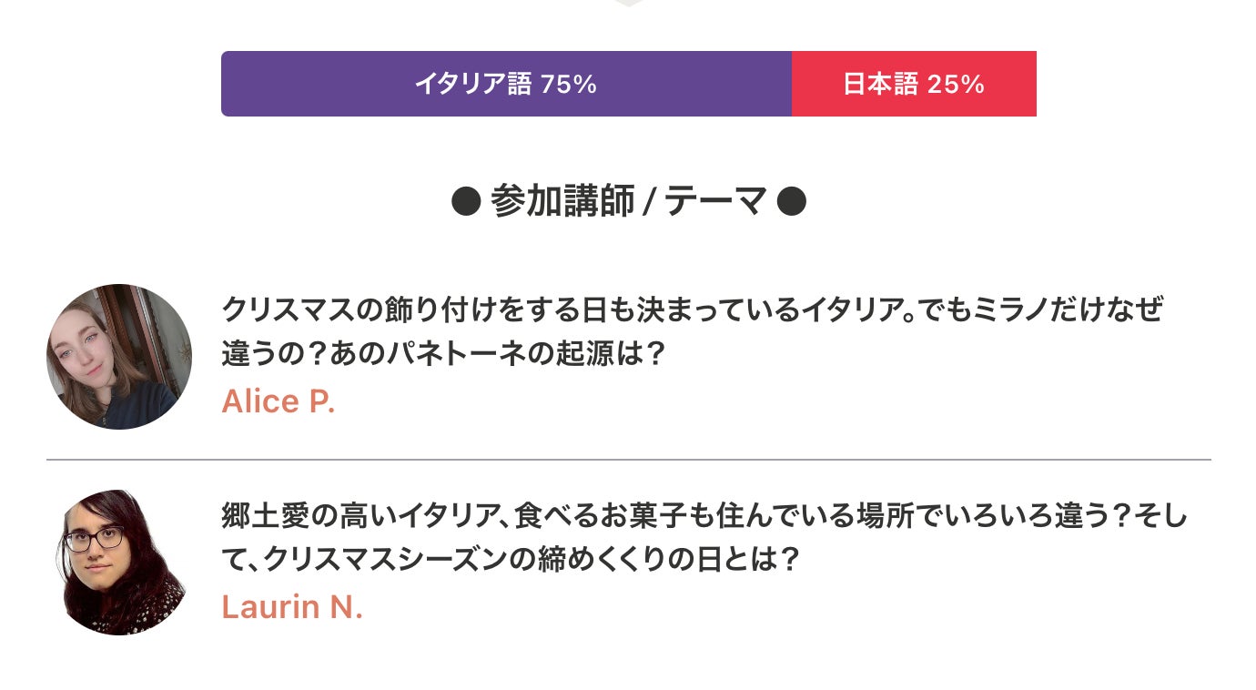 Alice P.講師(https://cafetalk.com/tutor/profile/?c=eJxLySkqqQx39fEPMcw0CfctyE9JCXZ1tLUFAGwCCCc.&lang=ja)が「クリスマスの飾り付けをする日も決まっているイタリア。でもミラノだけなぜ違うの?あのパネトーネの起源は?」について、そしてLaurin N.講師(https://cafetalk.com/tutor/profile/?c=eJwLjQzOsnR2T7SoSLP0CCvxyDZ29stztLUFAGDpB5E.&lang=ja)が「郷土愛の高いイタリア、食べるお菓子も住んでいる場所でいろいろ違う?そして、クリスマスシーズンの締めくくりの日とは?」についてお話しします。