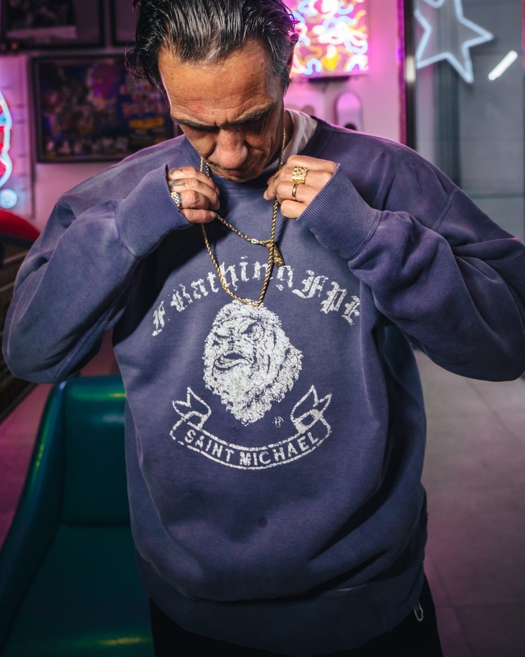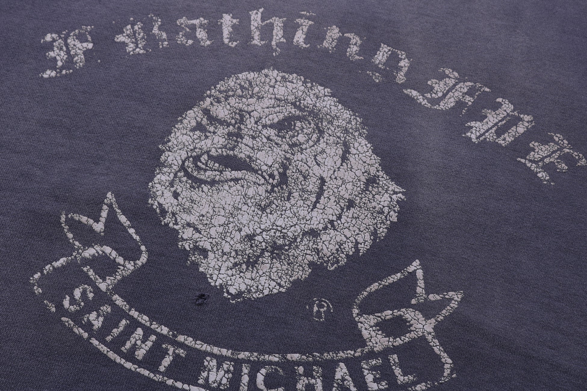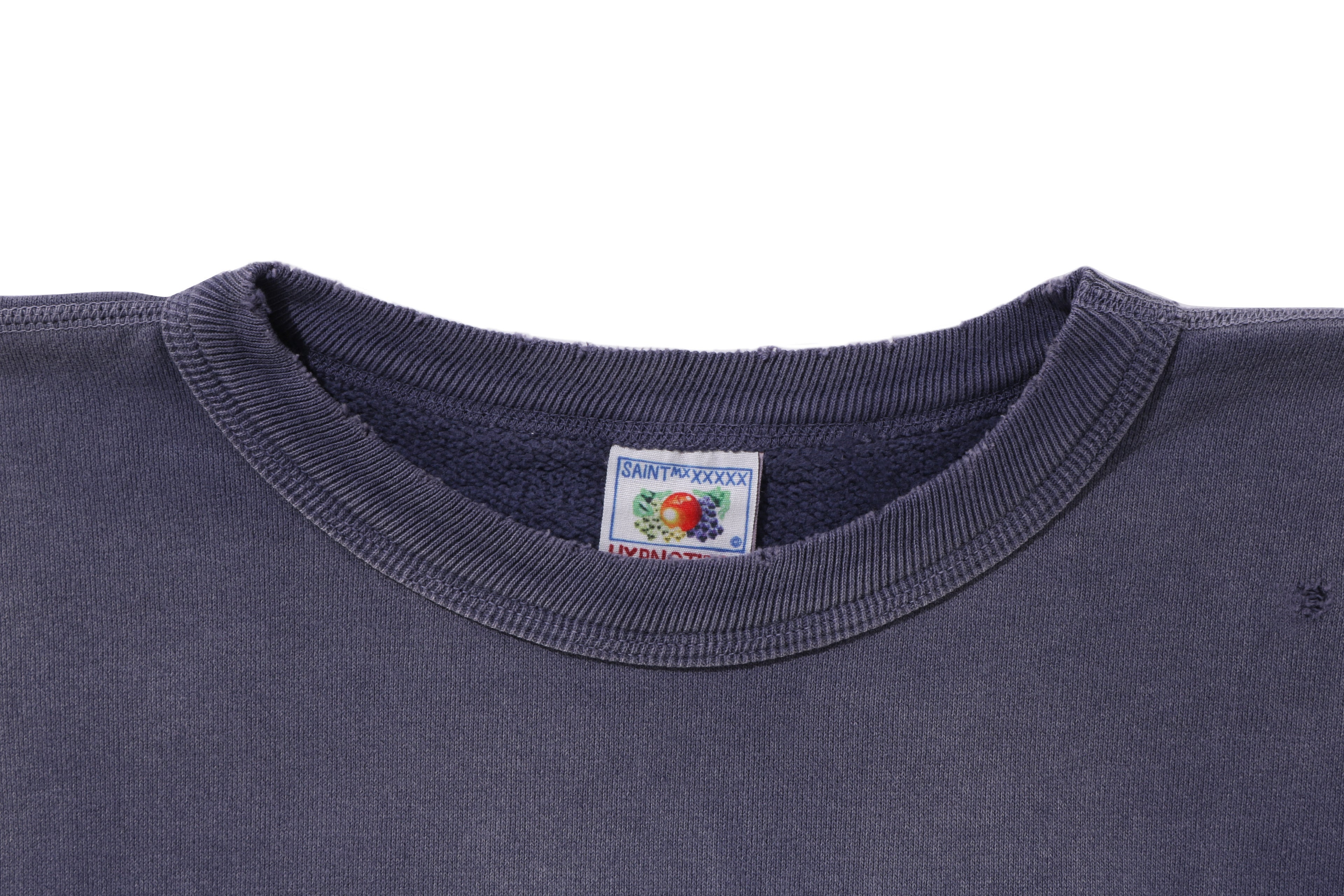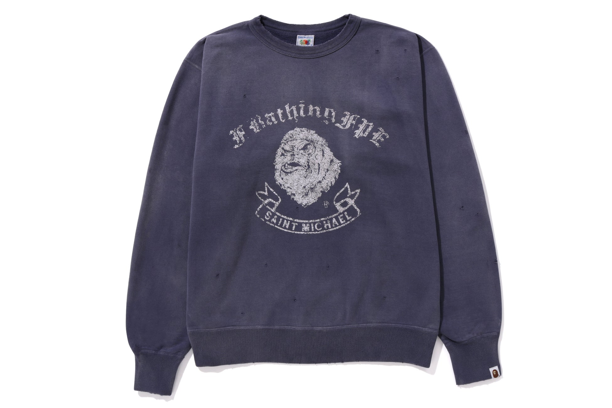 今回登場するクルーネックスウェットには、BAPE®︎が定番とするカレッジロゴからインスピレーションを得て、©SAINT Mxxxxxx独自のフィルターでアレンジしたグラフィックを、フロントとバッグに描きます。しなやかで肉厚、現代的なシルエットが特徴の©SAINT Mxxxxxxオリジナルボディに、ダメージや色落ち、プリントのヒビ割れといった非常に細かい本格的なヴィンテージ加工を施しています。また、左袖口にはAPE HEADのピスネームが付き、このアイテムが特別なコラボレーションであることを象徴します。