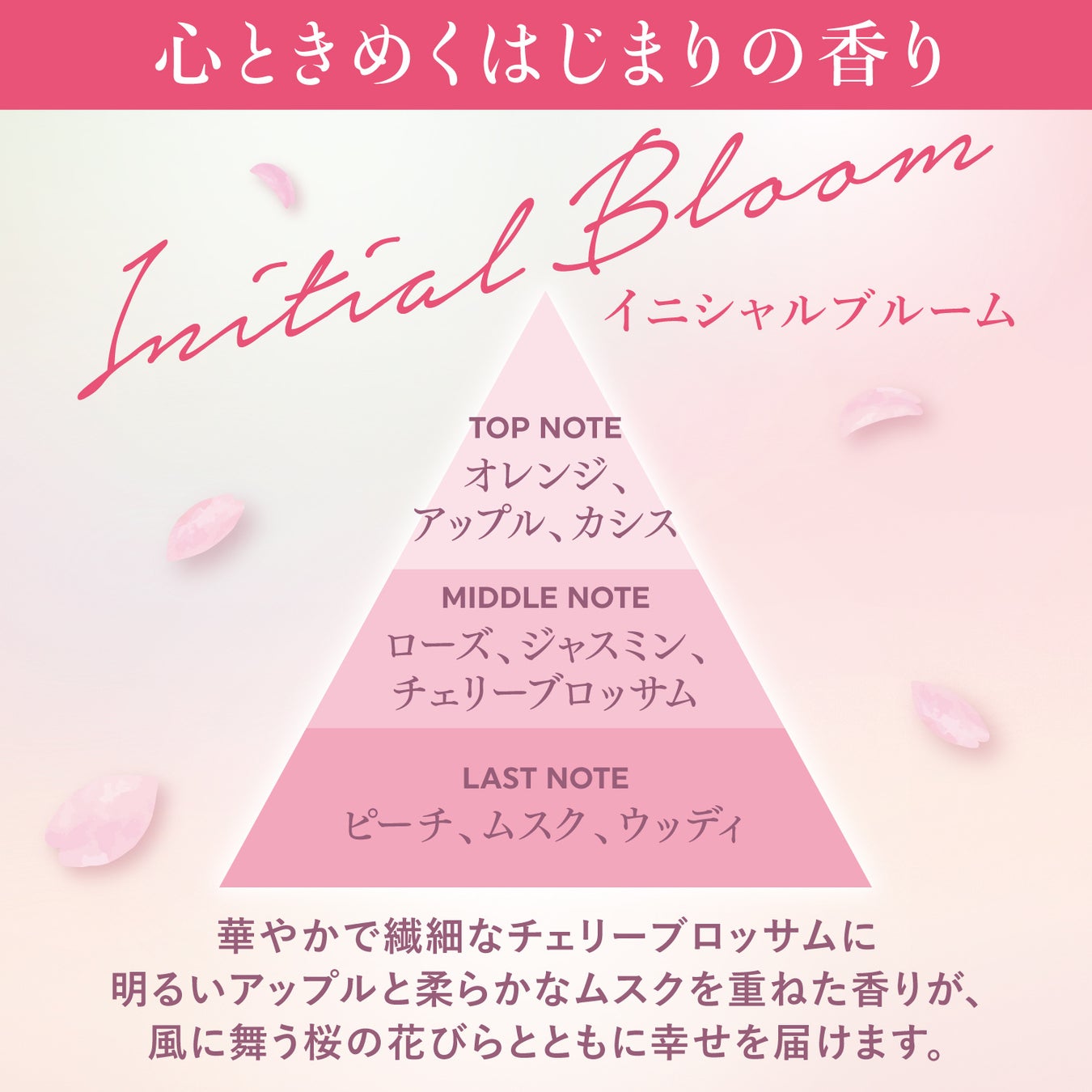 香り名は、“はじめの・最初の”を意味するInitialと、“花・開花する”を表すBloomの2つの言葉を組み合わせた名前です。一足先に感じる桜の香りで、待ち焦がれた春の訪れを祝福する高揚感と特別感を感じ、心が浮足立つような幸せな気分をお届けします。