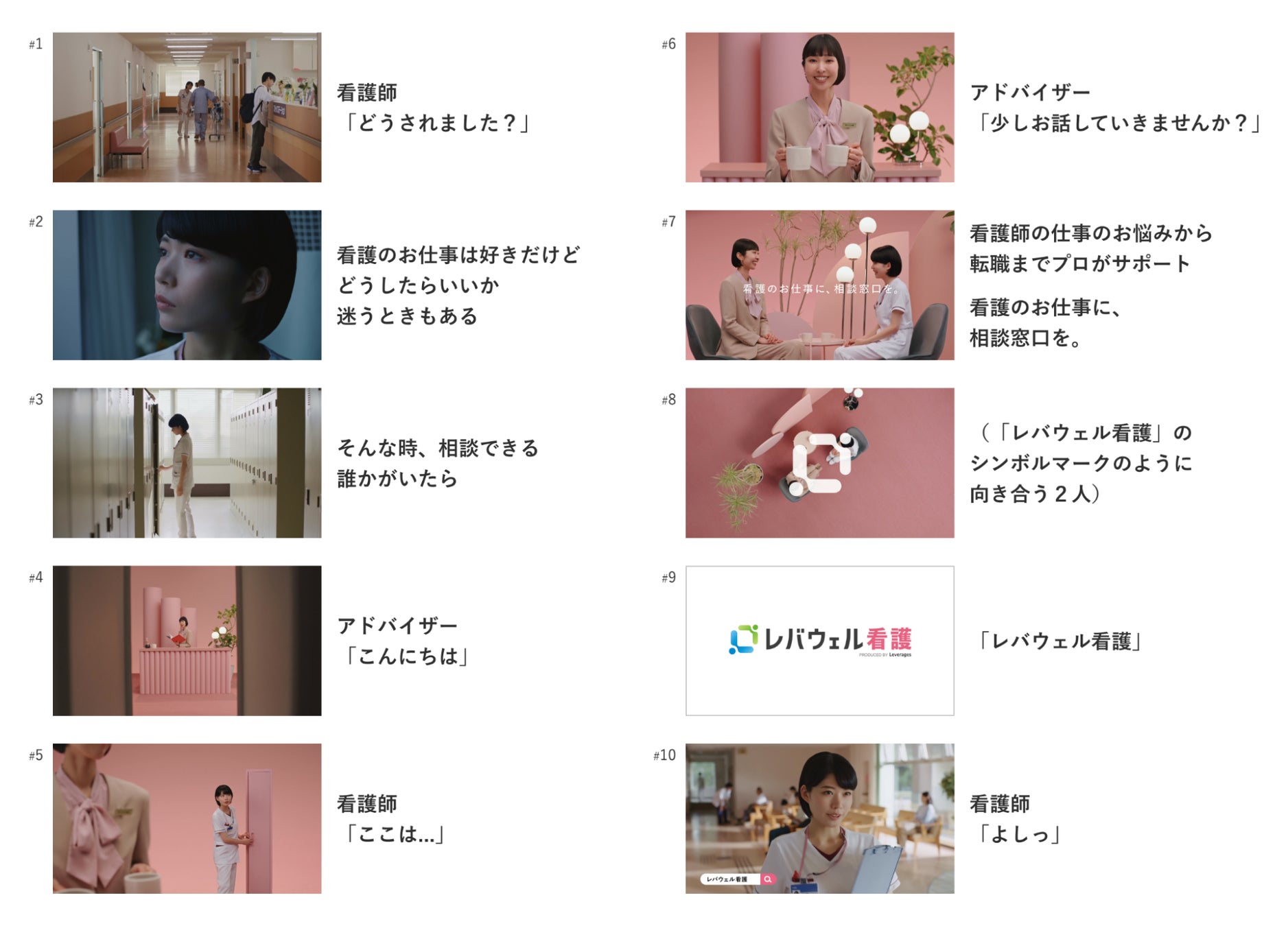 今回のCMは”看護のお仕事に相談窓口を。”をテーマに、悩みを持つ働く看護師と、その悩み解決をサポートするキャリアアドバイザーのストーリーとなっています。仕事にやりがいを感じる一方で、今後のキャリアや職場の人間関係、働き方など様々な悩みを持つ看護師。更衣室のロッカーを開けると、「レバウェル看護」のキャリアアドバイザーが温かみのある相談窓口へ迎え入れてくれます。様々な悩みを打ち明け、相談をすることで、看護師が前向きな心情へと変化していく様子を表現しました。