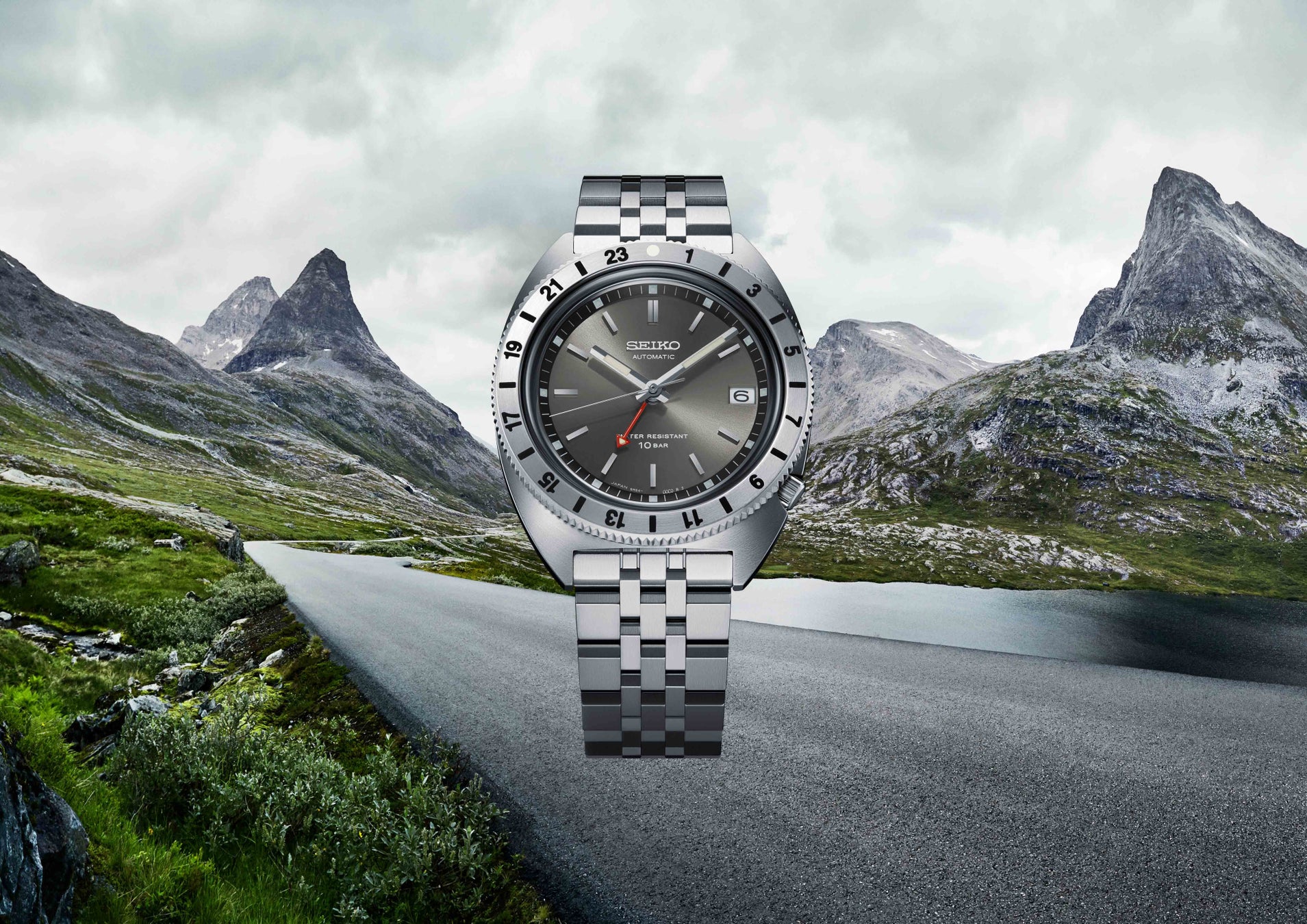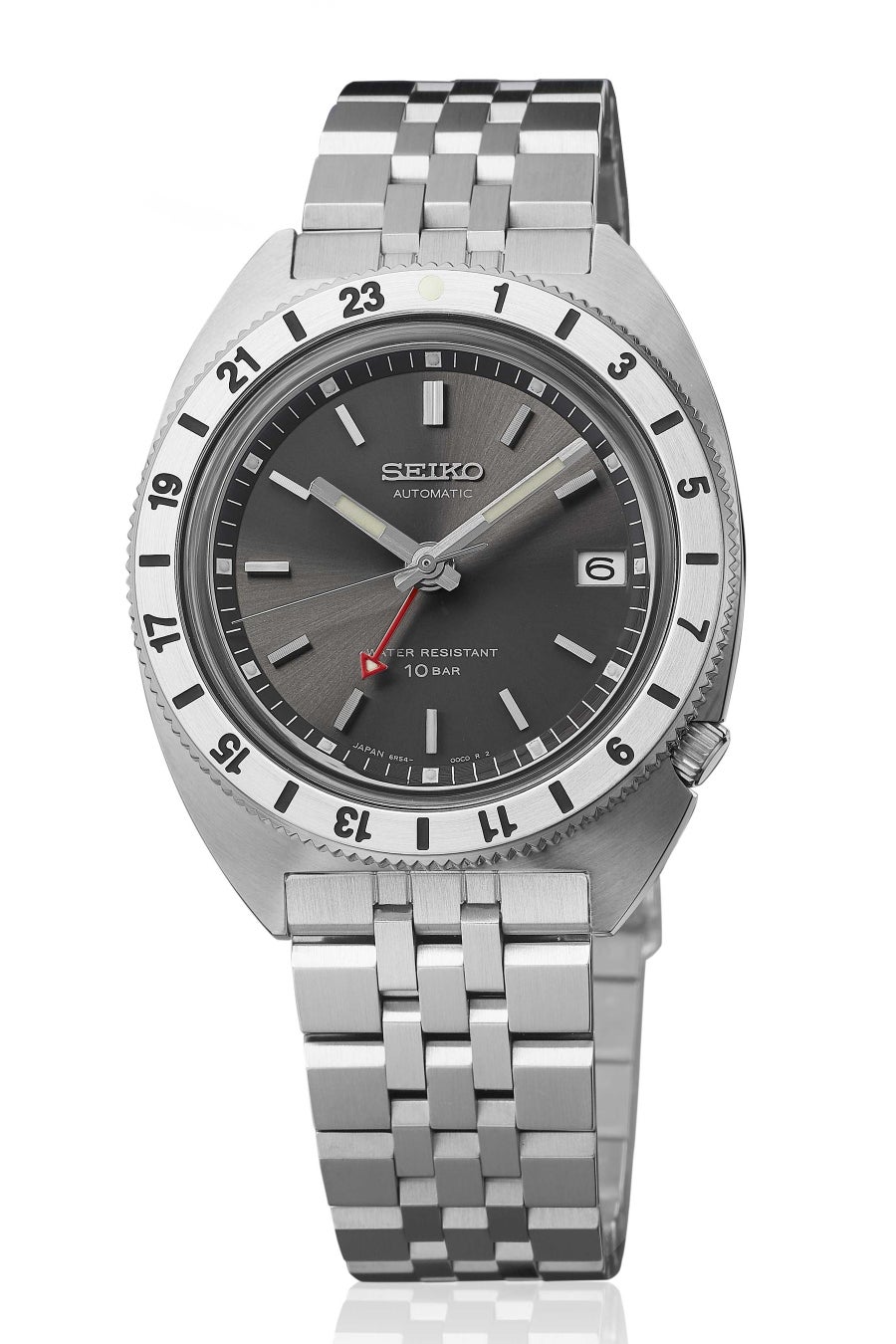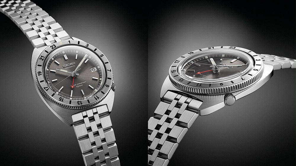 ダイヤル12時位置のセイコーロゴは現行ロゴに比べて縦幅が短い当時のロゴを踏襲。GMT針と時分秒針、インデックスなどもオリジナルモデルのデザインを再現しています。GMT針を異なる地域の時刻に合わせると、回転ベゼルを使うことで、3つの時刻を読み取ることができます。