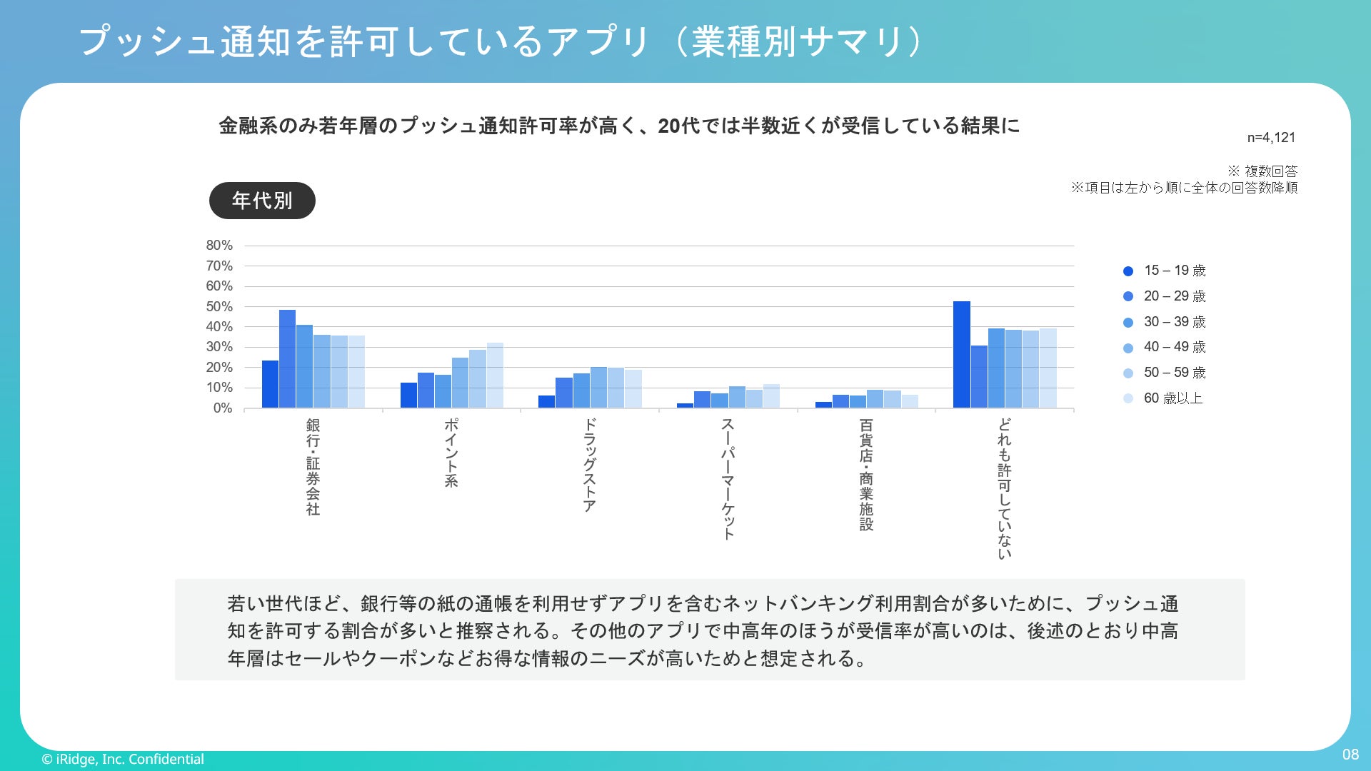 ・金融系アプリのみ若年層のプッシュ通知許可率が高く、20代では半数近くが受信していることが明らかに
