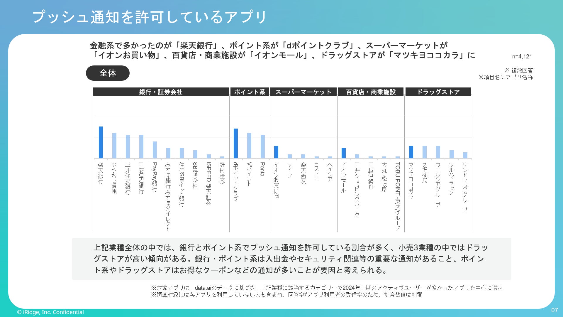 ・プッシュ通知受信率の高いアプリは金融系では「楽天銀行」、ポイント系が「dポイントクラブ」、スーパーマーケットが「イオンお買い物」、百貨店・商業施設が「イオンモール」、ドラッグストアが「マツキヨココカラ」