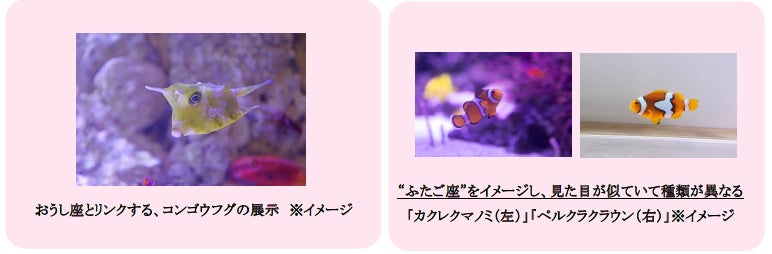 フロアに並ぶ11本の水槽には、星座から連想する生きものを集め、“おうし座”の映像とリンクする2本の角を持った「コンゴウフグ」や“ふたご座”をイメージし、見た目は同じで異なる種類の「カクレクマノミ」と「ペルクラクラウン」などの展示がお楽しみいただけます。
