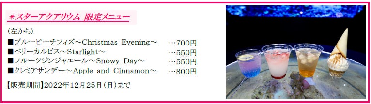 発光サンゴの水槽が並ぶカフェバーは、真っ赤なリボンとオーナメントの映像でダイナミックに彩られ、クリスマスならではの心躍る空間へと姿を変えます。3分に一度、満天の星空につつまれるショータイムもあり、お好みのドリンクを片手にロマンチックな時間をお過ごしいただけます。