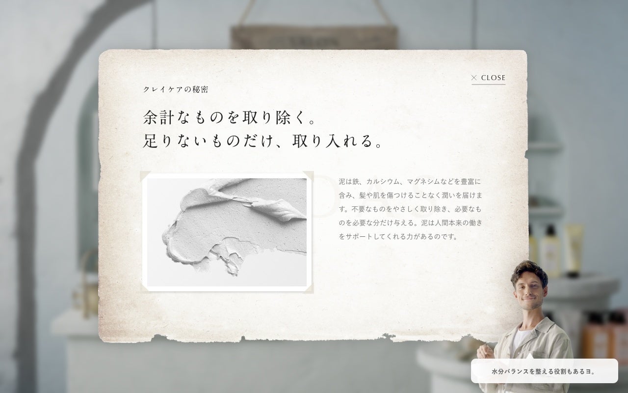 特設サイトではクレイケアの紹介はじめ、DROASに配合されている泥の成分についての解説のほか、ひとり一人にぴったりのDROASラインナップ製品を診断してくれるコンテンツや製品詳細情報を掲載しています。
