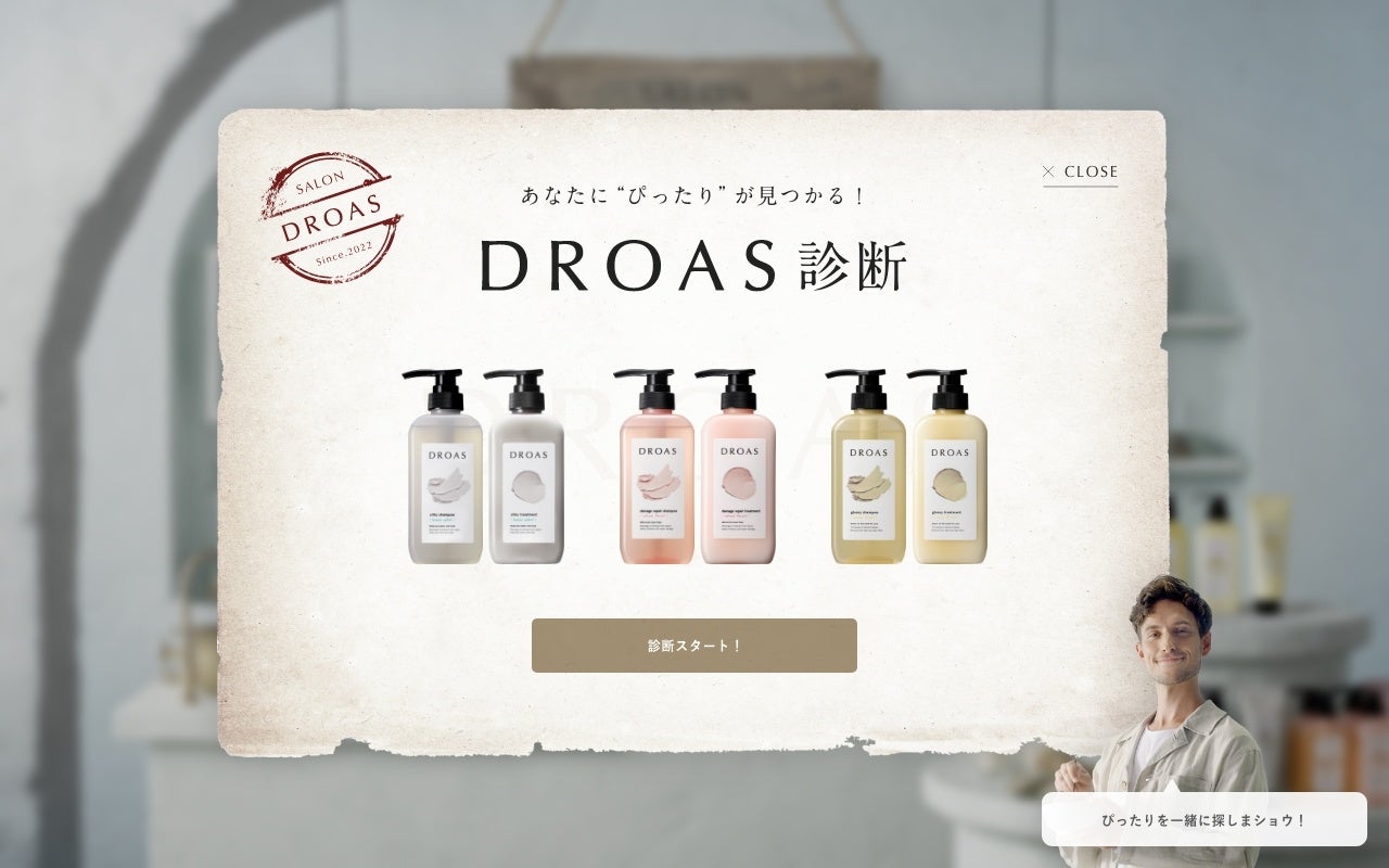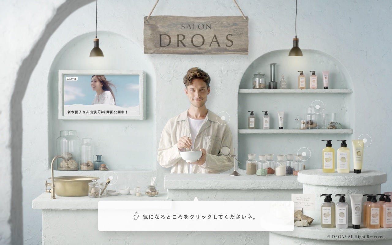 また、昨年10月に九州エリアとWEBで先行公開された新木優子さん出演TVCMが3月7日(月)より全国で放映されます。それにあわせ、TVCMに登場した架空のヘアサロンをモチーフに、特設ウェブサイト「SALON DROAS(URL:https://droas.jp/campaign/salon-droas/)」を3月7日(月)より公開いたします。特設サイトではDROASに配合されている泥の成分やクレイケアについての紹介や、あなたにぴったりのDROASラインナップ製品を診断してくれるコンテンツなどが掲載されています。