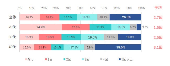 女の転職type会員に、転職経験について尋ねると、最も多かったのが「5回以上」26.0%、次いで「3回」16.9%、「0回」16.7%でした。平均は2.7回です。年代別で見てみると、20代は「なし」、30代は「3回」と「5回以上」、40代は「5回以上」が最も多く、年代が高くなるごとに転職回数が多くなることがわかりました。