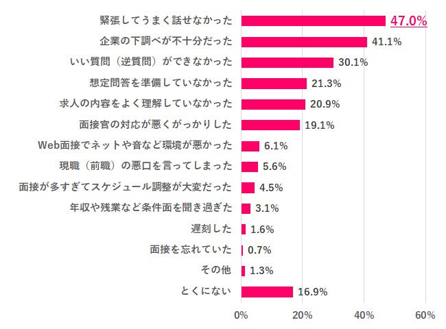 転職経験がある人に、面接での失敗や後悔したことについて尋ねると、1位「緊張してうまく話せなかった」47.0%、2位「企業の下調べが不十分だった」41.1%、3位「いい質問(逆質問)ができなかった」30.1%となりました。「とくにない」は16.9%に過ぎず、大多数の人が失敗や後悔をした経験があることがわかります。