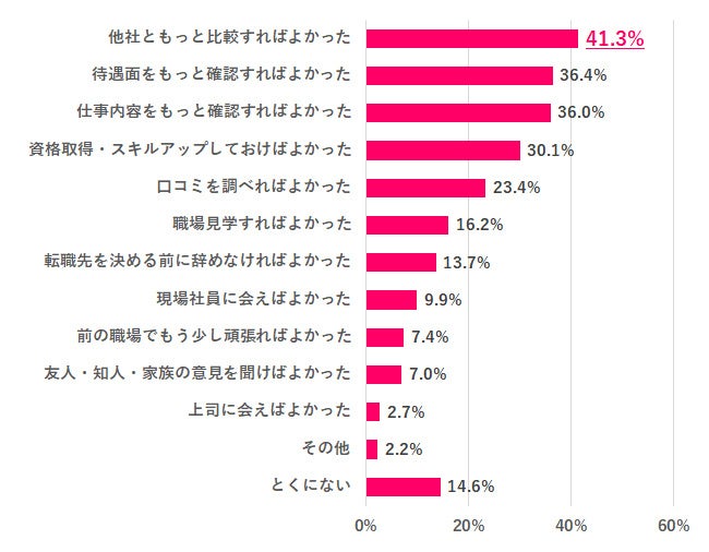 転職経験がある人に、今思えば、転職先を決める前にしておけばよかったことを尋ねると、1位「他社ともっと比較すればよかった」41.3%、2位「待遇面をもっと確認すればよかった」36.4%、3位「仕事内容をもっと確認すればよかった」36.0%となりました。「とくにない」は14.6%に過ぎず、大多数の人が様々な面での確認不足や後悔を感じていることがわかりました。
