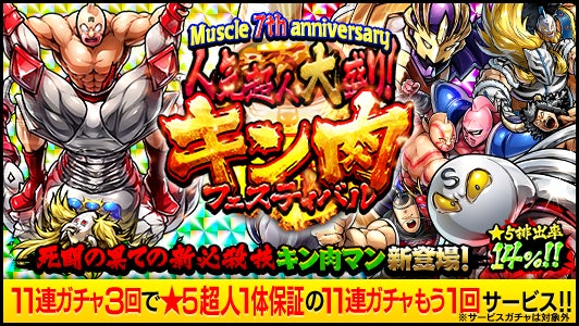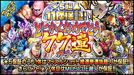 配信開始から7周年を記念して、1人1回のみ無料で引けるガチャ「★5超人11体保証!とにかくおめでとう77連ガチャ」を開催します。本ガチャでは、★5超人を11体保証で仲間にすることができます。なお、11体中2体は「天衝き超える悪魔の威風 悪魔将軍」や「友情に返り咲く奇跡の力 キン肉マン」、現在連載中のキン肉マンでも大活躍した「ゴッドセレクテッド キン肉マンスーパー・フェニックス&キン肉マンビッグボディ」などを含む一部のMUSCLE超人の中から2体が必ずゲットできます。