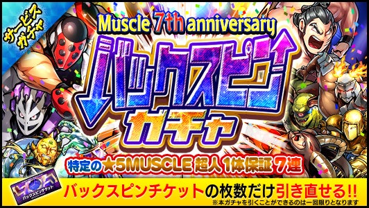 7周年記念で実施する「Muscle 7th anniversary バックスピンガチャ」では、7連ガチャを最大7回まで引き直せる形式となっています。