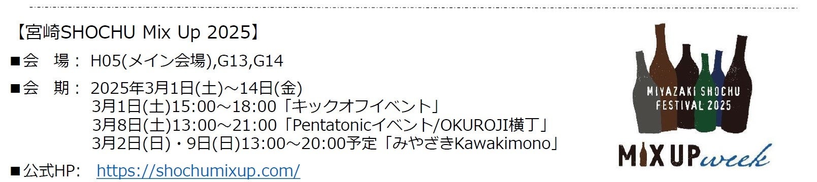 「宮崎SHOCHU MIX UP2025」の開催を記念して、国内トップバーテンダーが宮崎の焼酎を用いて開発した焼酎カクテルの提供や宮崎県内から来場した13蔵元による焼酎試飲がお楽しみいただけるイベントを開催。