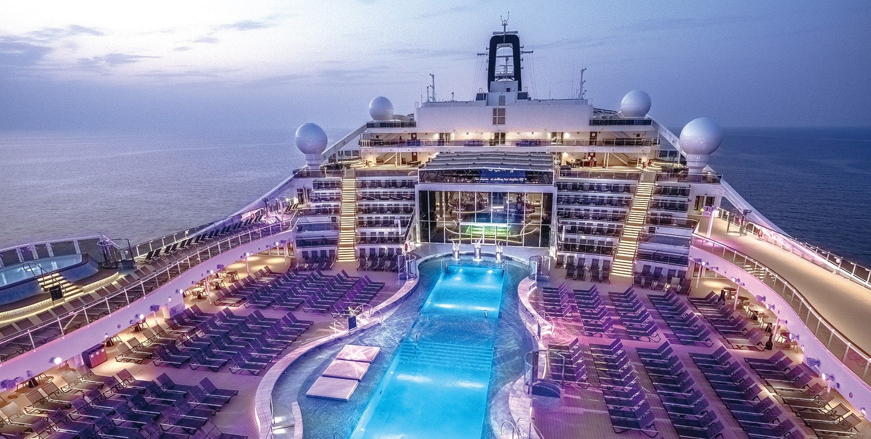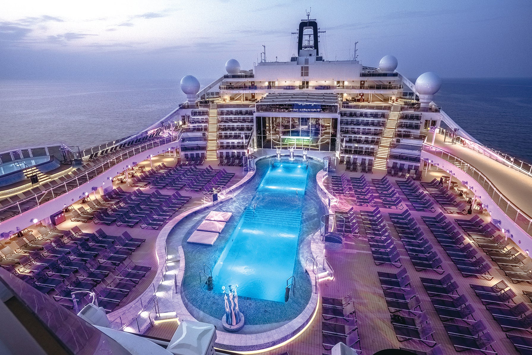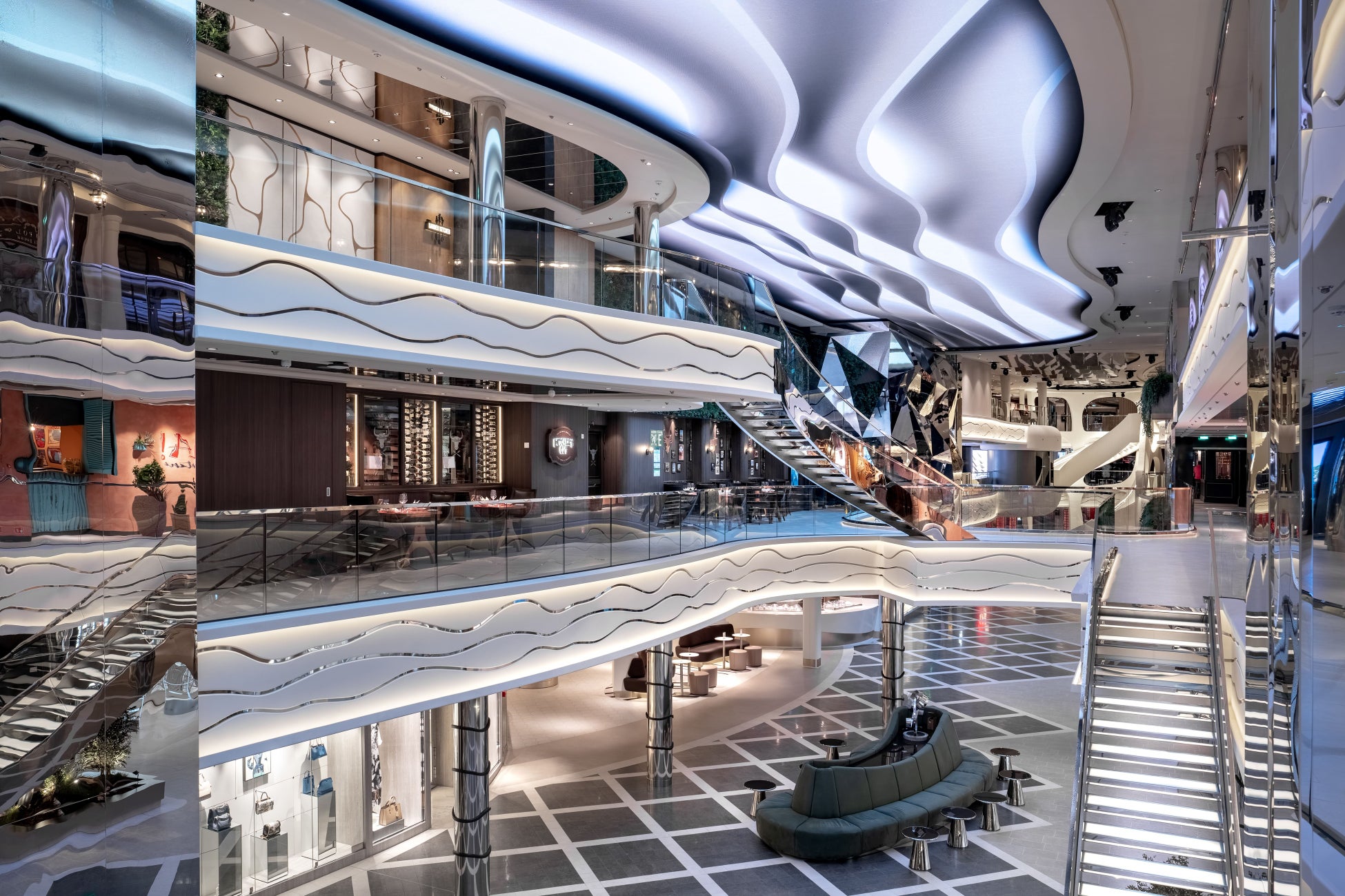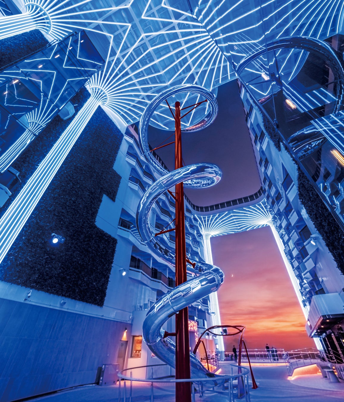 船内104mに渡る圧巻のプロムナードは、半分が吹き抜けになっており解放感のある空間が広がります。76mの高さから滑り降りるスライダー「ザ・スパイラル」はデッキ22からデッキ11のプロムナードまで爽快に滑り降ります。また、プロムナードの半分は迫力のLEDスクリーンで様々な演出が楽しめます。