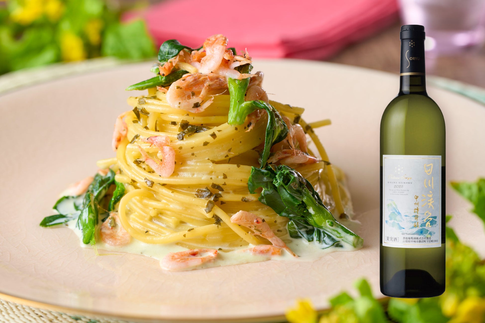 左)バジルと桜海老の香りと旨み、クリームのまろやかな味わいが楽しめるパスタには、優しく凛とした酸と厚みのある味わい、バランス感のある辛口白ワイン「日川渓谷 甲州樽発酵」を合わせるのがおすすめです。