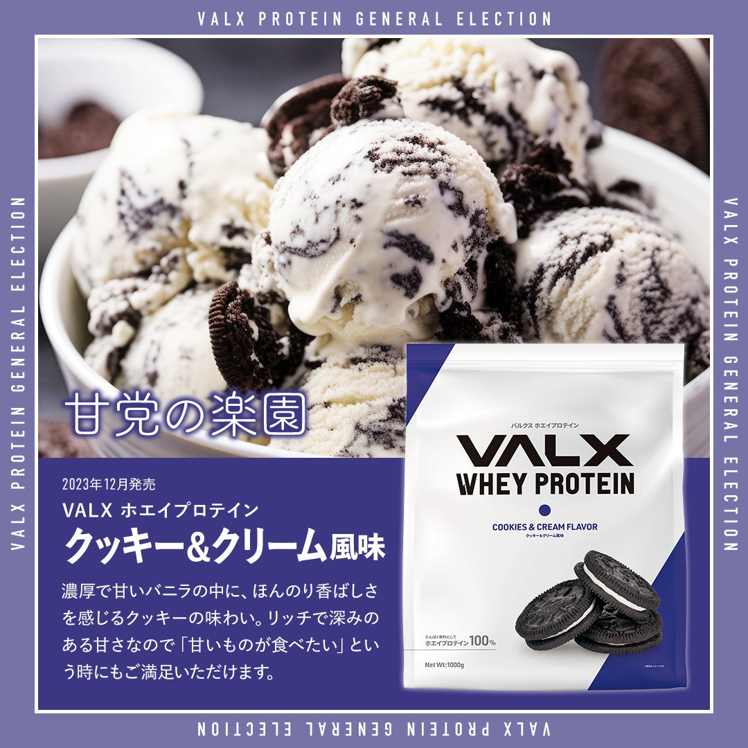 多くのご投票をいただいた中で、最も支持を集めたフレーバーは「クッキー&クリーム風味」となりました。こちらのフレーバーは、2025年秋よりVALX ホエイプロテインの定番商品として販売を開始する予定です。