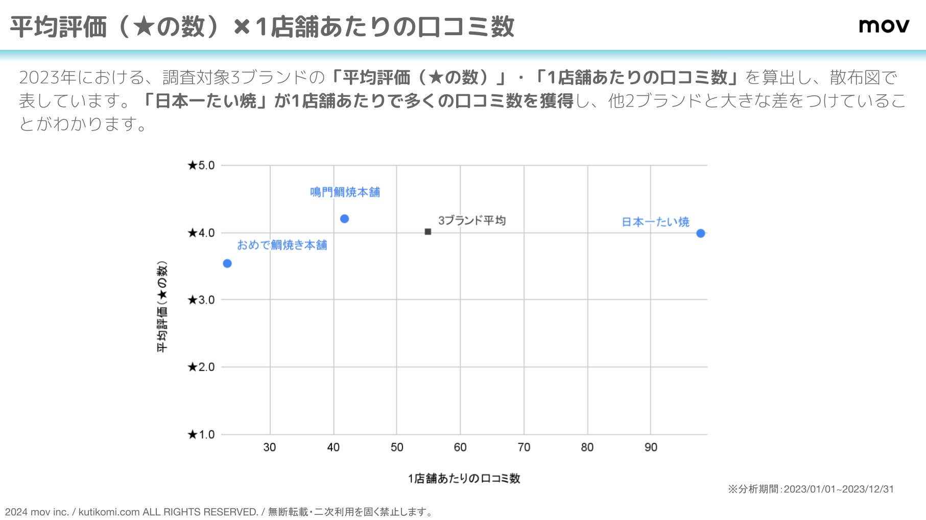 2023年における、調査対象3ブランドの「平均評価(★の数)」・「1店舗あたりの口コミ数」を算出し、散布図で表しています。