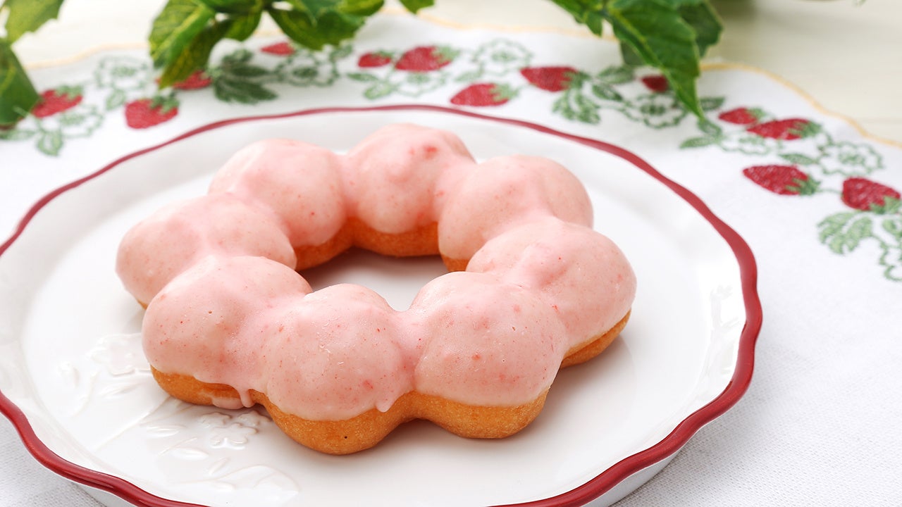 商品特長:もちもちとした弾力ある生地のドーナツに、いちごチョコをコーティングしました。もっちりとした食感と見た目も可愛いドーナツです。