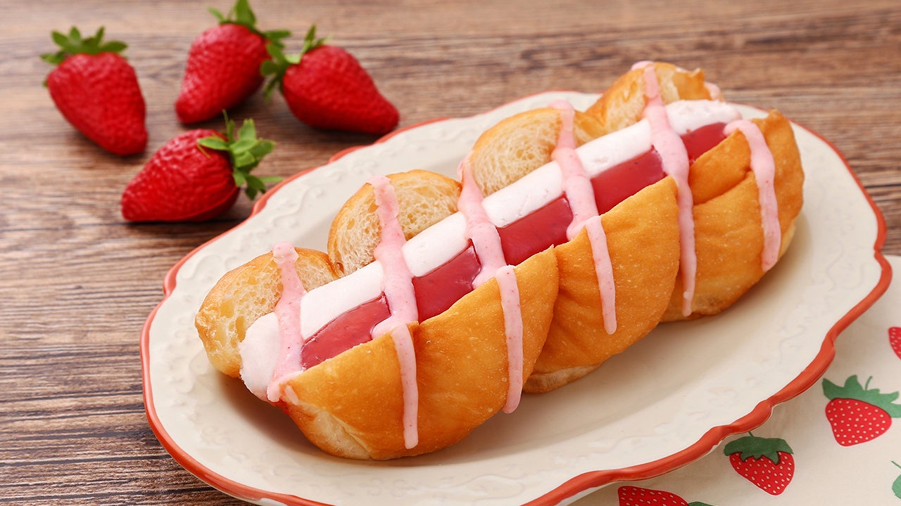 商品特長:ふんわりとしたツイストドーナツに、いちごジャムといちごホイップをサンドし、さらに上からいちごチョコをかけたいちごづくしのドーナツです。