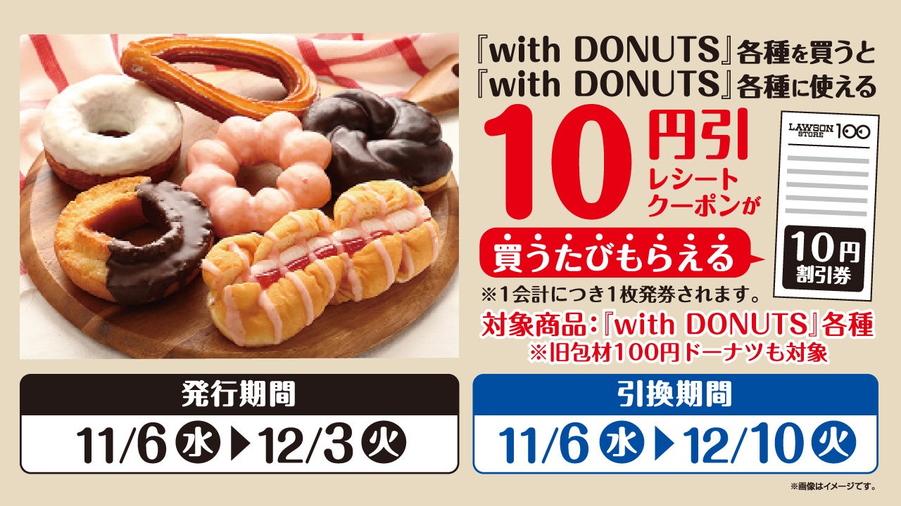 さらに2024年11月6日(水)から2024年12月3日(火)まで、対象の『with DONUTS』を購入すると、次回『with DONUTS』各種購入時にご利用いただける10円引クーポンを進呈するお得なキャンペーンを実施いたします。是非このお得な機会に『with DONUTS』をお楽しみください。