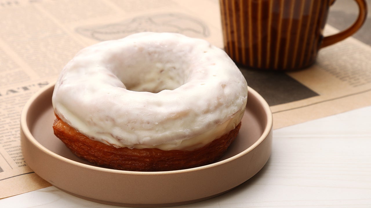 商品特長:クロワッサンのように層になったさっくり生地にホワイトチョコをかけました。外はカリッと、中はサクサクふんわりとした食感が特徴です。