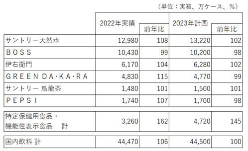 その中で、当社は「サントリー天然水」、「BOSS」、「伊右衛門」、「GREEN DA・KA・RA」など基幹ブランドのマーケティング活動強化によって、2022年の国内販売数量は前年比106%と総市場以上の伸びを達成しシェアを拡大することができました。